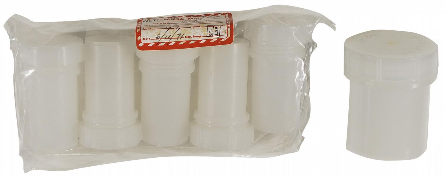 Set of five 30cc plastic bottles and lids used in the Lunar Receiving Laboratory to hold lunar samples upon their return to Earth. All five are sealed in plastic which bears a red Lunar Receiving Laboratory label indicating the bottles were cleaned for service on June 11, 1971. Also included is a larger plastic bottle and lid.