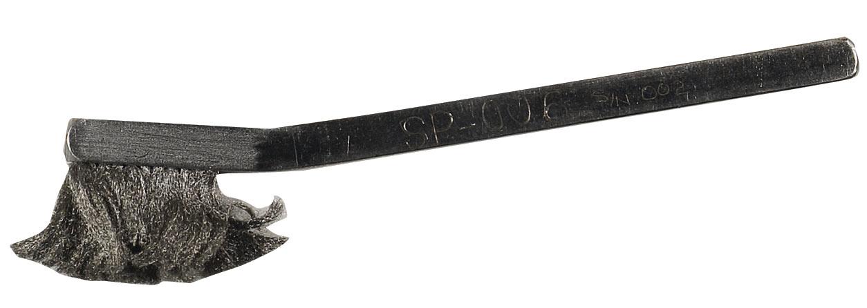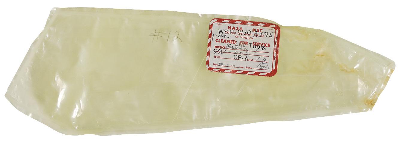 Metal and steel wool brush used in the Lunar Receiving Laboratory. Metal brush bears what appears to be steel wool bristles at the end, which appear to have scrubbed many moon rocks, and is etched with “SP-006, S/N 002,” on one side. Brush was engineered and designed to remain sterile in the laboratory environment. Brush is accompanied by its pale yellow original plastic bag, bearing a red Lunar Receiving Laboratory label noting that the brush was cleaned for service on December 2, 1971. The first such brush we have seen.