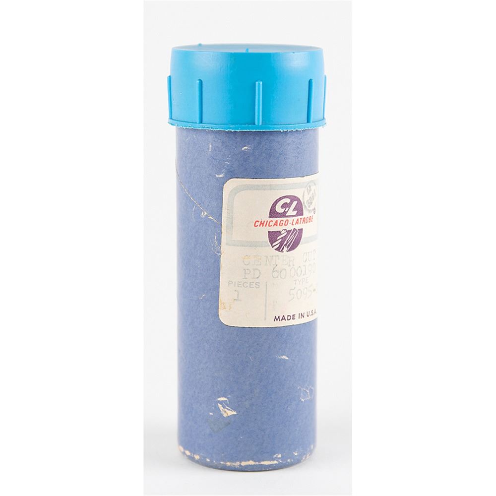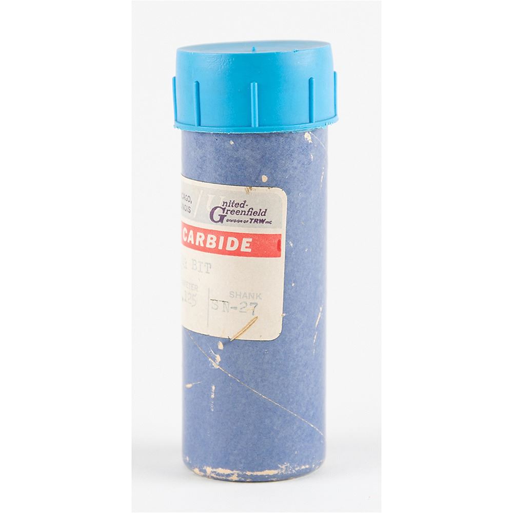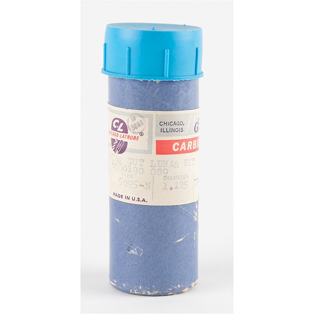 Apollo Lunar Surface Drill (ALSD) center cut bit designed for boring into the lunar surface, measuring approximately 2.5è long with a 1è diameter, featuring a five-toothed drill bit opening with triangular cutter at center, and five holes around the edge designed to shed material out the sides. Includes its blue Chicago-Latrobe tube, labeled: "Center Cut Lunar Bit, PD 6000190 009." The ALSD bit is made of heat-treated 5150 steel with tungsten carbide cutting blades.