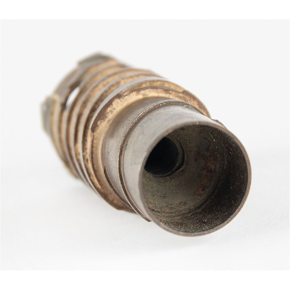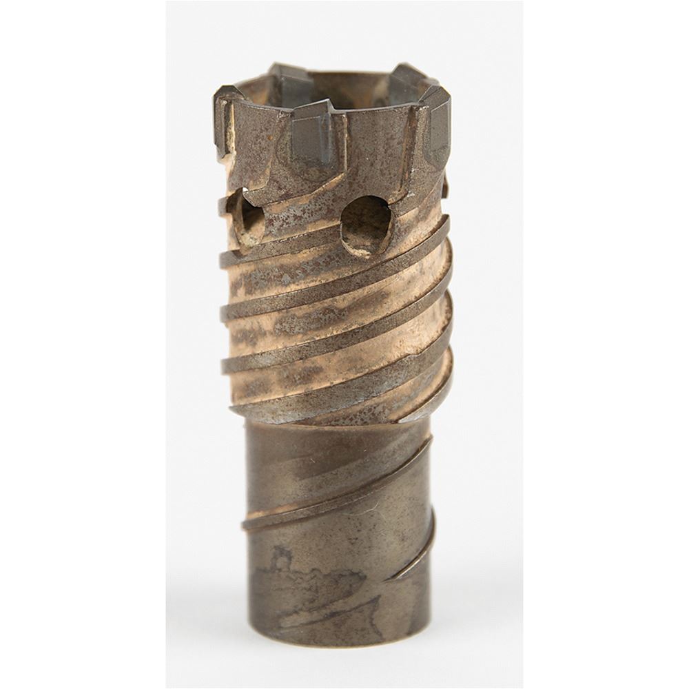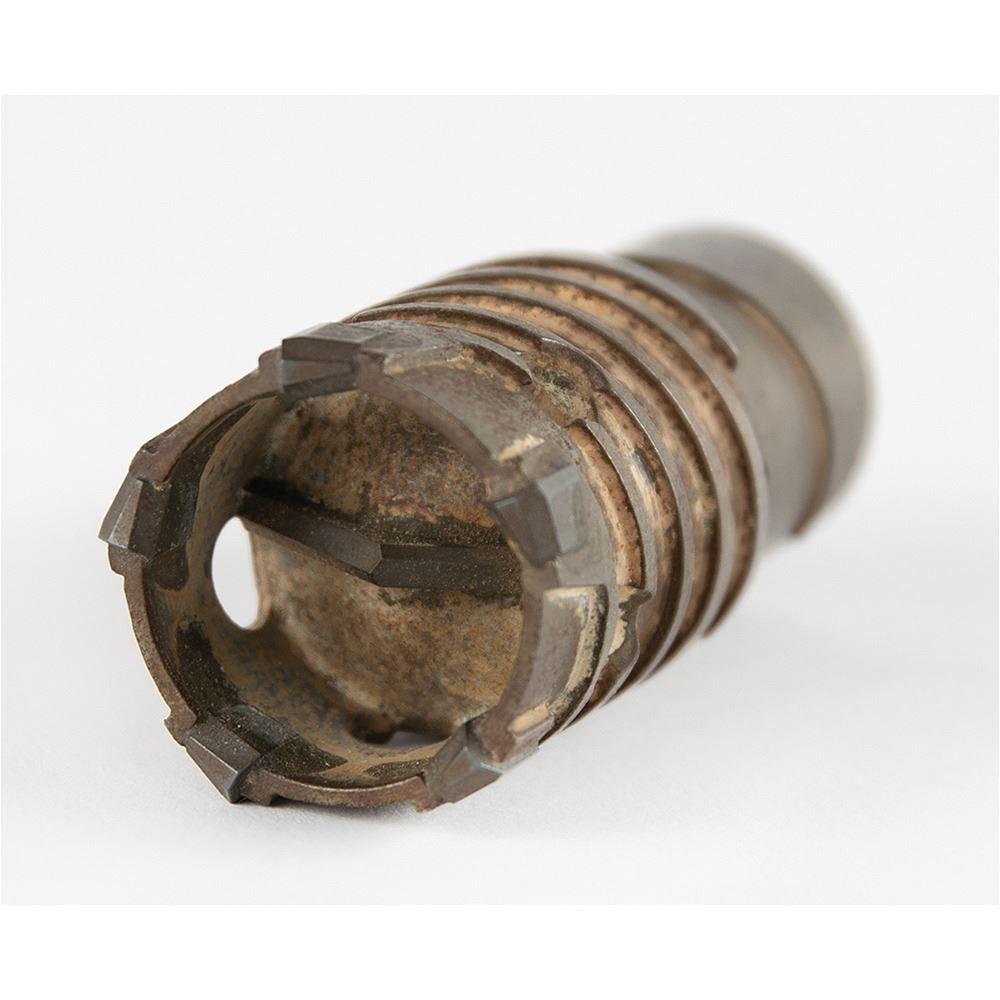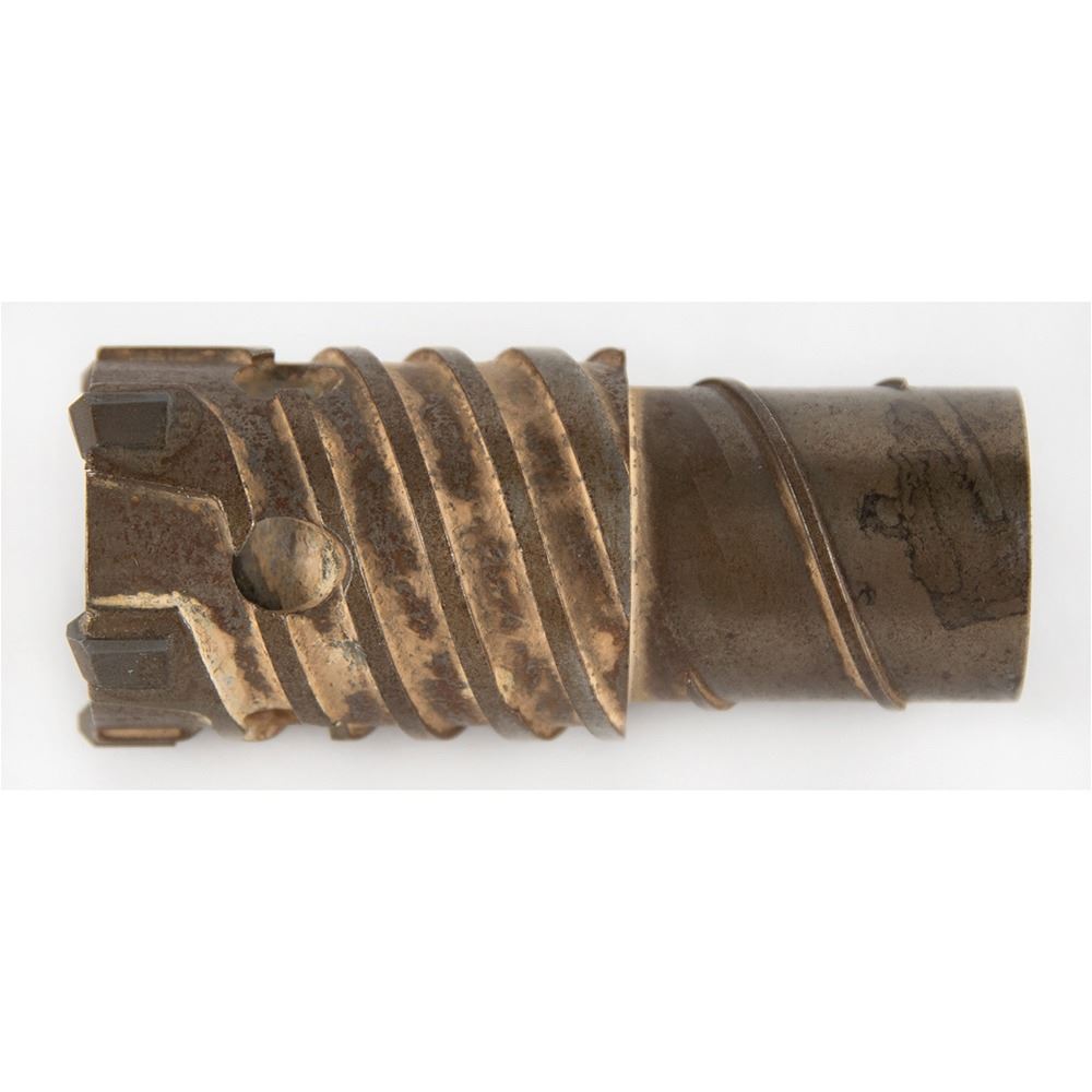 Apollo Lunar Surface Drill (ALSD) center cut bit designed for boring into the lunar surface, measuring approximately 2.5è long with a 1è diameter, featuring a five-toothed drill bit opening with triangular cutter at center, and five holes around the edge designed to shed material out the sides. Includes its blue Chicago-Latrobe tube, labeled: "Center Cut Lunar Bit, PD 6000190 009." The ALSD bit is made of heat-treated 5150 steel with tungsten carbide cutting blades.