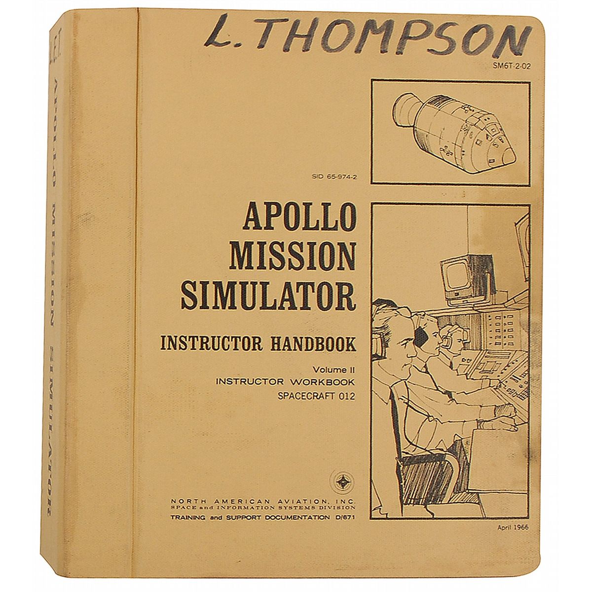 Huge hard bound Apollo Mission Simulator Instructor Handbook, Volume II, Spacecraft 012, dated April 1966, by North American Aviation, Inc., 10 x 11.5, and 4.5? thick. Introduction states “The purpose of this instructor handbook is to provide detailed instructions for using the Apollo Mission Simulator…to train flight crew personnel for Apollo Mission 204A.” Handbook is divided into six sections. Previous owner’s name “L. Thompson,” is written on the front cover. Lawrence Thompson was a supervisor in the simulator program. In fine condition. It was during this training that not only the astronauts, but their equipment also, was put through its paces to insure that all were in prime flying condition. A rare volume that hasn't been recognized as to its true rarity previously.