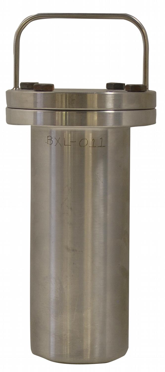 Lunar receiving laboratory stainless steel containment vessel, 8.5 x 4.5, used to hold moon rocks upon their return to Earth. This two-piece vessel has four bolts which attach the two parts together, as well as a carrying handle to top portion. Both pieces are etched with serial numbers BXL-011. A heavy-duty vessel such as this would have been used to transport lunar samples outside of the laboratory. Accompanying the vessel is a now-detached NASA tag, dated June 4, 1971, noted that it has been cleaned for service.