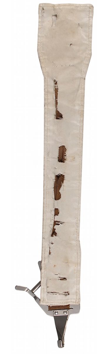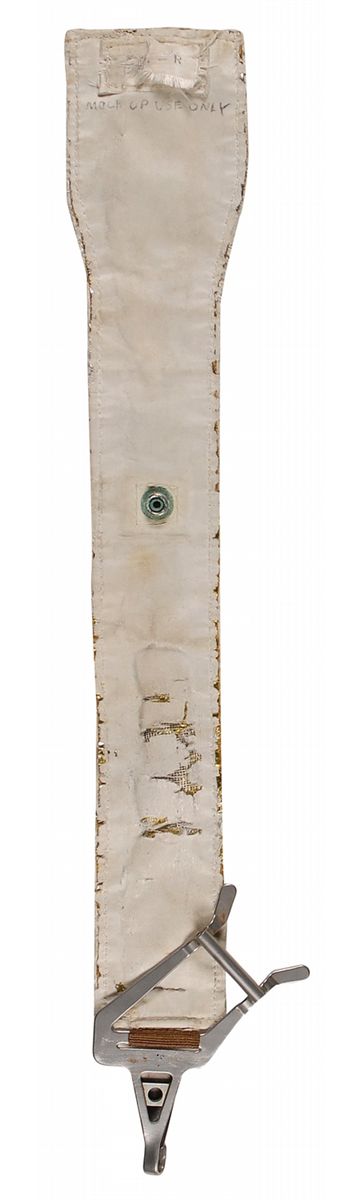 A well-used Class III trainer Apollo Portable Life Support System (PLSS) strap from an Apollo A7-LB spacesuit used during training for walking on the lunar surface. Beta cloth covered strap measures 17? long with a latching clip at the end. Back of the strap shows areas of Kapton foil, has a snap located at the center, and is labeled at the top in an unknown hand, “Mock Up Use Only.” In very good condition, with expected wear and soiling from use.