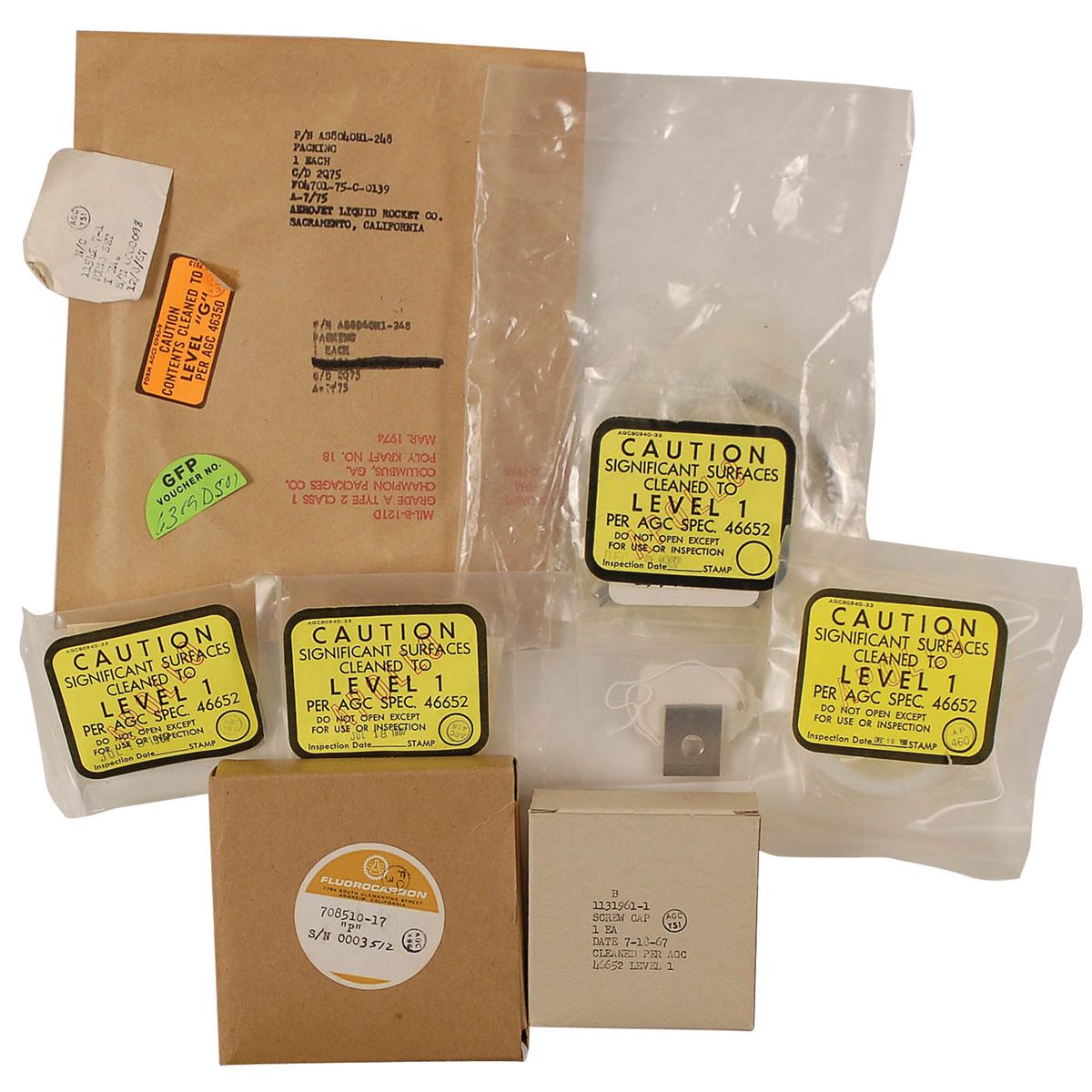Collection of six unused spare parts associated with the Service Propulsion System (SPS) Main Engine in the Apollo Command Service Module. Each part is in sealed bags with appropriate labels and cleaning tags. Parts include a screw cap, screw cap socket head, a three-piece ring set, and a gasket. Manufacturers include Aerojet Liquid Rocket Company and Fluorocarbon.