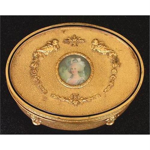 Produced by, Apollo of New York, circa 1910, this ormolu or brass jewelry box features a lid with a centered 1 1/2 inch portrait of a Victorian lady with a floral ormolu border and a celluloid covering. The lid is further adorned with ormolu cherubs and scroll work, The Interior is lined with mauve Velvet. The box is adorned with four cherubs above its four feet. Marked on the Bottom ? APOLLO 3281. Measures 5 1/2 inches wide x 4 inches deep x 2 1/4 inches tall and, with the exception of a little wear is in excellent condition.