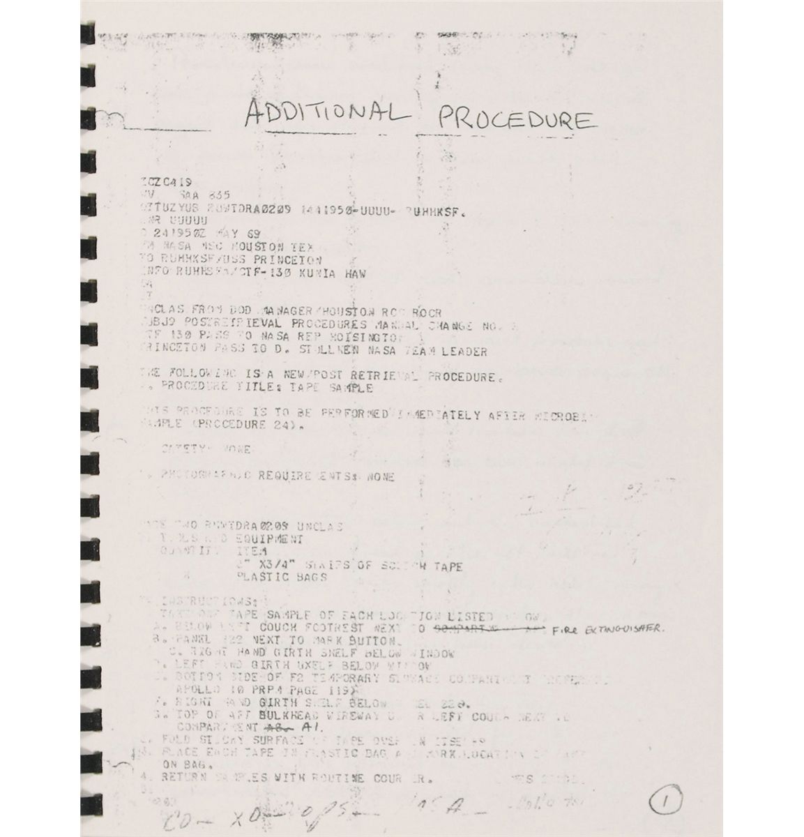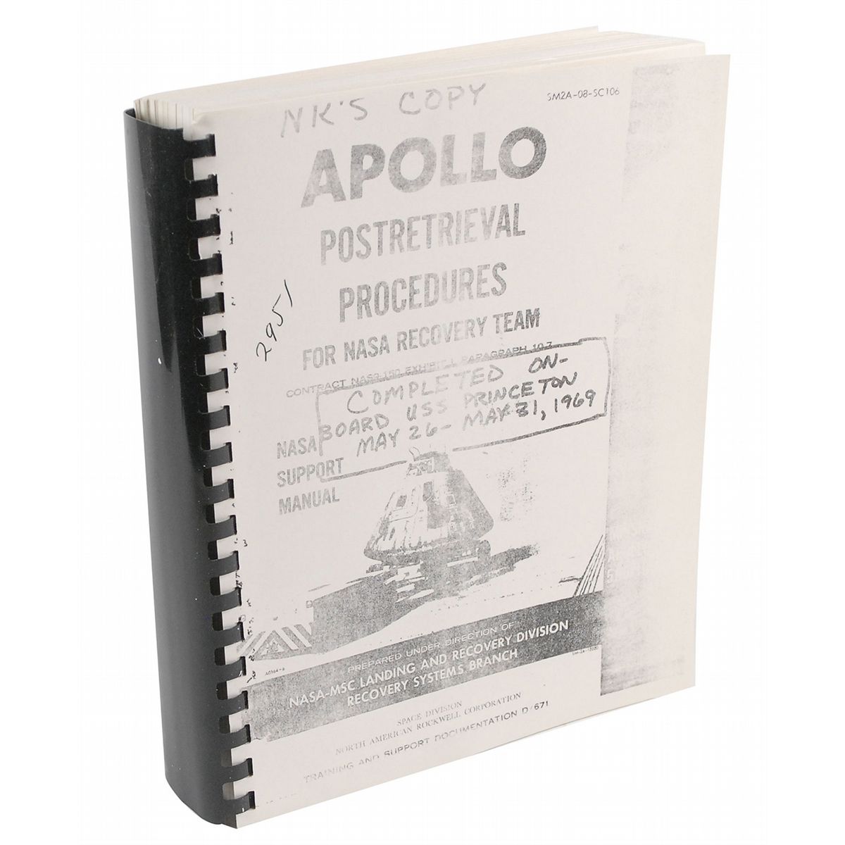 Spiral-bound photocopy of the Apollo Postretrieval Procedures for NASA Recovery Team, SM2A-08-SC106, 9 x 11, 354 pages. Published by the North American Rockwell Corporation, this manual lists all the procedures for the inspection of the interior and exterior of the capsule, as well as the panel settings and removal of the crew’s equipment. Copied cover is labeled by the previous owner, “NK’s Copy, Completed on-board USS Princeton, May 26–May 31, 1969” which would indicate use during the Apollo 10 recovery. In fine condition.