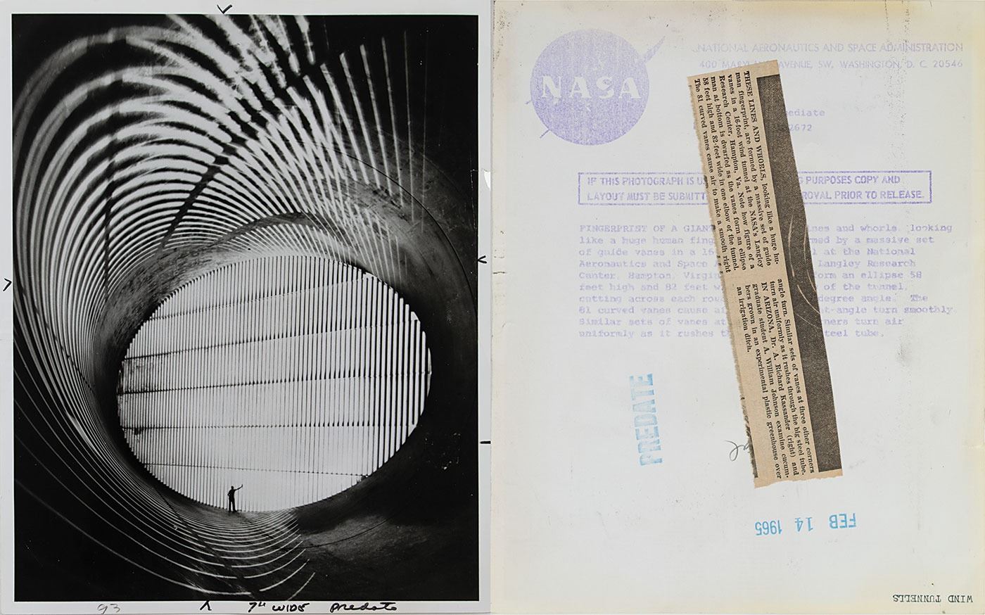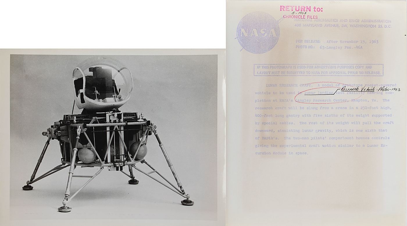 The highlight of the collection is a group of 16 official glossy NASA photos documenting the early designs and innovations of the Apollo Program, dated between 1962 and 1968, with all featuring NASA caption text on the reverse, and some bearing notations and affixed clippings. Includes three color black-numbered NASA examples, each bearing “A Kodak Paper” watermarks, notations, and a “Return to: Chronicle Files” stamp on reverse, with one photo, depicting a Gemini test astronaut being lowered into a mock spacecraft, bearing NASA caption text. Photo subjects include: a model prototype of the lunar lander (November 1963); the Echo II satellite (February 1965); a 16-foot wind tunnel at the Langley Research Center (February 1965); a 210-foot diameter tracking antenna for the Pioneer C interplanetary spacecraft (December 1967), and the airborne Lunar Landing Research Vehicle (November 1964).