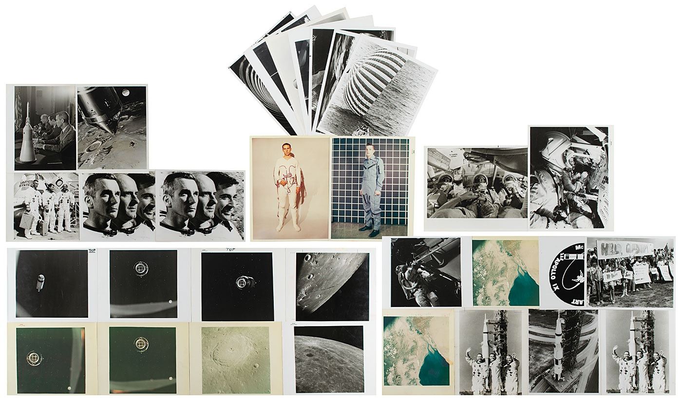 Apollo 9 (8)—various photos honoring NASA’s third manned mission, which includes the following images: LMP Rusty Schweickart during an EVA, the mission emblem, a crowd of well-wishers during the crew’s return stop at a Bahamian Island, two overhead color shots of the Earth (both with “A Kodak Paper” watermarks to reverse), the transportation of the Saturn V rocket, and two identical crew portraits. With the exception of the Earth photos, the reverse of each features NASA caption text. Six of the photos bear annotations to reverse, and the Earth photos also feature “Return to: Chronicle Files” stamps.
