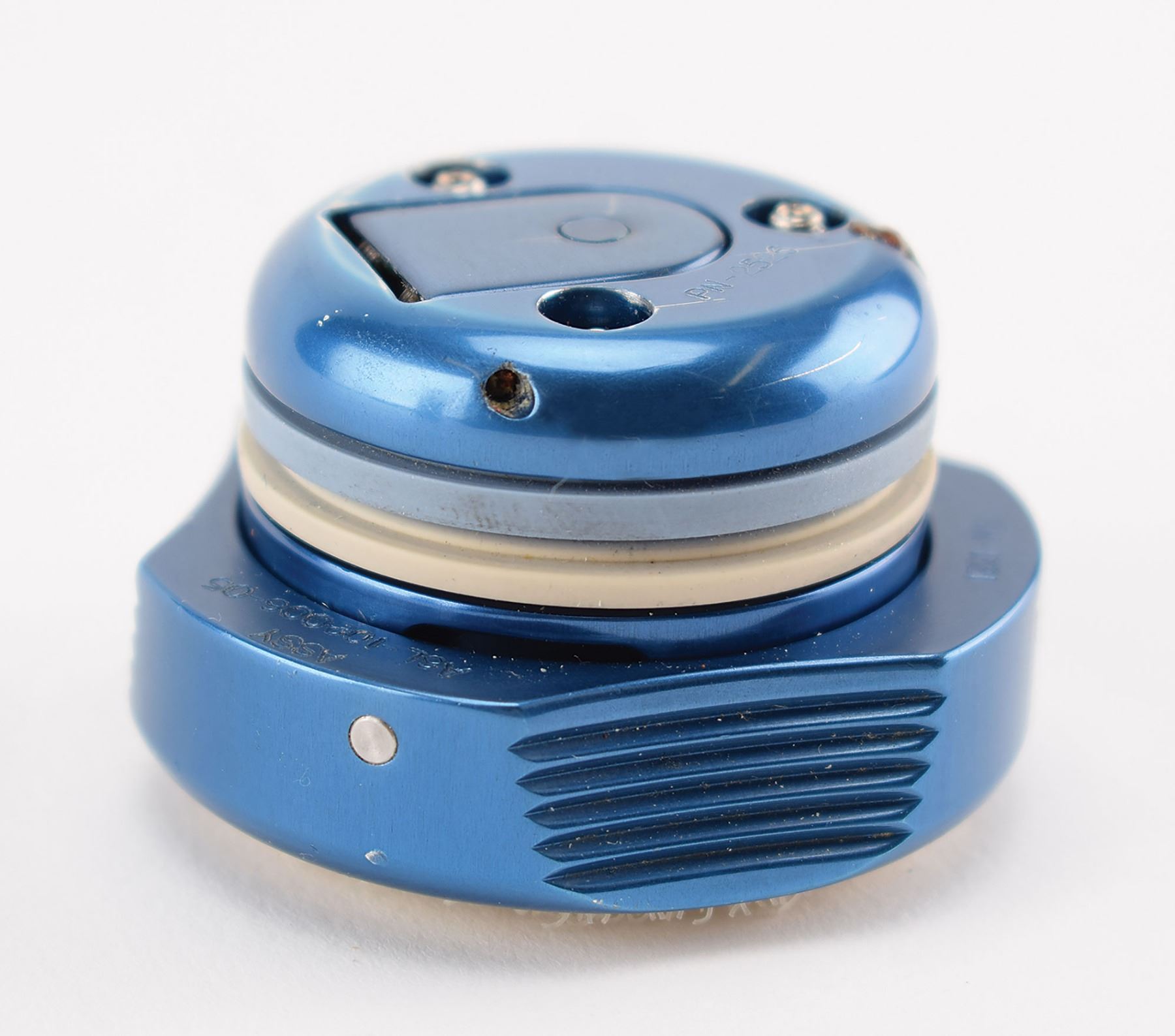 Uncommon blue metal Apollo pressure helmet feed port made by Air Lock, 1? thick and 1.75? in diameter, with part numbers on port, "PN–2526, SN–392," and part numbers on cover, "ASSY, A6L–102006–05, ASSY 9184, SN–1321." The port cover features two strips of Velcro. In fine condition. The feed port gave astronauts the ability to pass a food or water valve, later called a Contingency Feeding System, into the helmet area in the event the crew had to stay pressurized inside the suits due to an emergency.