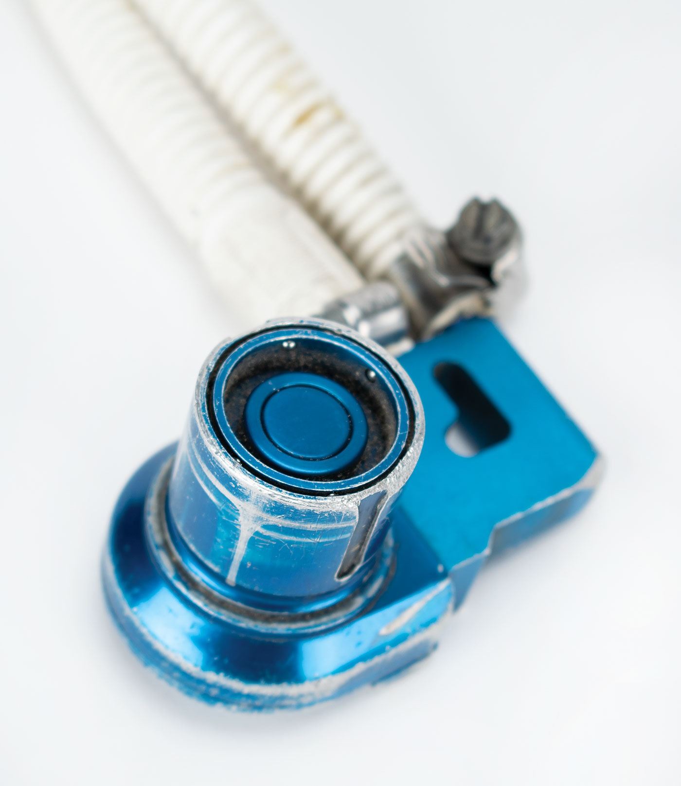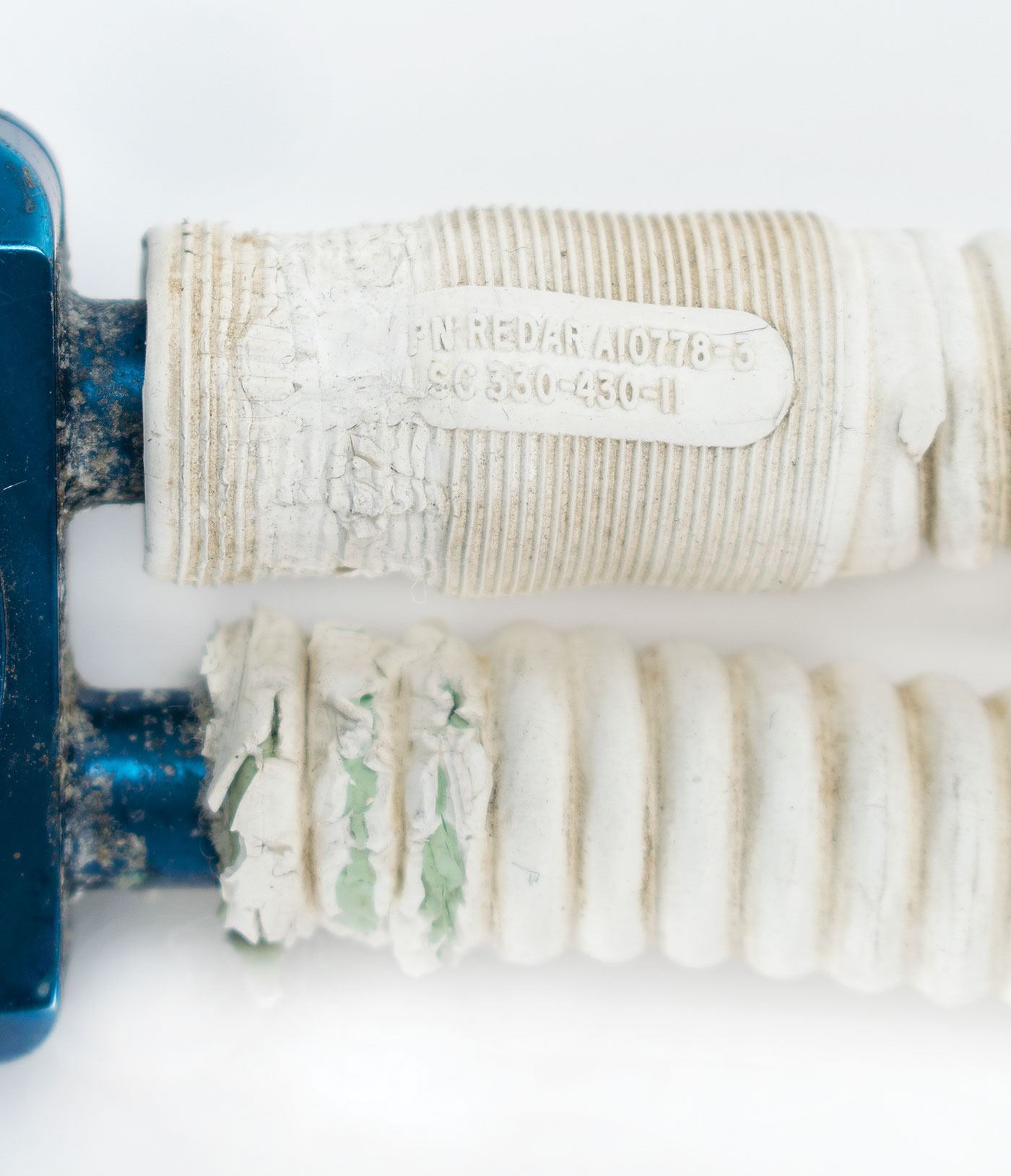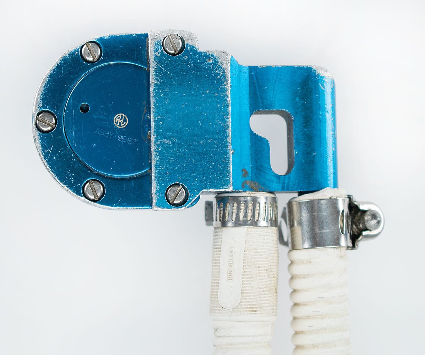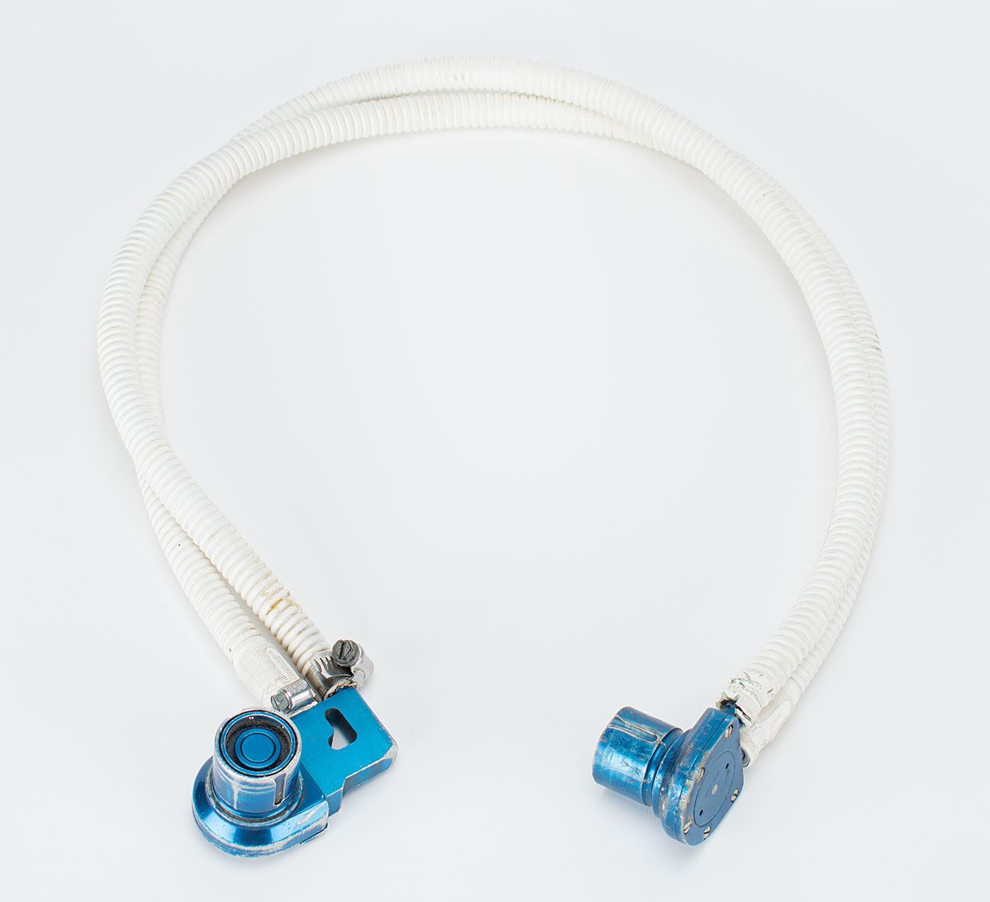 Hose and fitting assembly used to connect the Primary Life Support System to the Apollo A7L space suit, measuring 37? in length and terminating with a pair of Air-Lock fittings with matching part numbers: "Assy. 9267, SN 195, SV710831–3." Ends of hoses also bear identical part numbers: "PN: Redar A10778-3, SC 330-430-11, Lot No. 208." In very good to fine condition, with heavy wear from use, including scuffing and soiling to fittings and wear to hose ends.