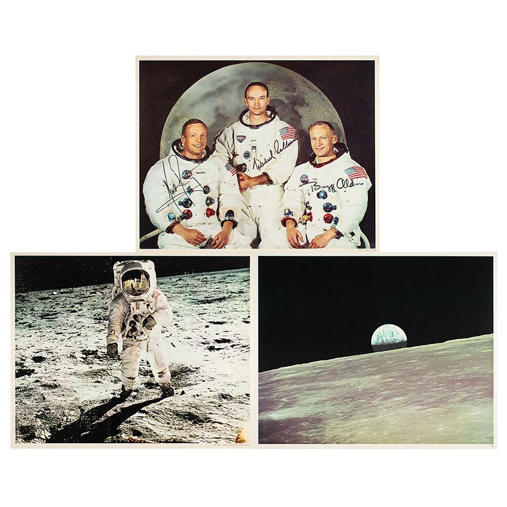 Uncommon group lot of 13 oversized official color 20.75 x 16.75 NASA lithographs honoring Apollo missions 8, 9, and 11. Each lithograph is captioned in the lower right corner with a number and/or title: Apollo 8: AP 907 (Earthrise); Apollo 9: AP 905 (Dave Scott EVA), AP 906 (Lunar Module Spider), and AP 908 (Command Module Gumdrop); and Apollo 11: AP 1101 (Apollo 11 Crew), AP 1102 (Old Glory, First Flag on the Moon), AP 1103 (Tranquility Base), AP 1104 (Aldrin Stepping from LM to Moon‰Ûªs Surface), AP 1105 (Aldrin & LM Leg on the Moon), AP 1106 (Aldrin & Old Glory on the Moon), AP 1107 (Armstrong & Aldrin Planting Old Glory on the Moon), AP 1108 (Aldrin Walking on Moon Surface), and AP 1110 (Armstrong and Aldrin Returning from Lunar Surface). Includes a color 16 x 20 lithograph of LMP Jim Irwin saluting the American flag during the Apollo 15 mission, published by Impact in 1980. The Apollo 11 crew litho bears facsimile signatures inherent to the print. In overall fine condition, with trivial edgewear.