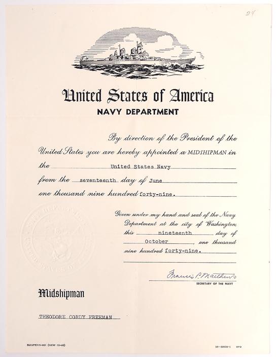 Apollo Program, 1949, Theodore (Ted) Freeman Midshipman's Appointment. As issued by the US Navy Department. This 1949 document reads: By direction of the President of the United States, you are hereby appointed a Midshipman in the United States Navy…". There is a large negative seal at left and the document is signed by Francis P. Matthews, Secretary of the Navy. Freeman went on to become an astronaut (1963, Group 3 Astronaut Candidates) and a Captain in the Air Force. He was killed in the crash of his T-38 jet in October 1964 when a goose smashed through the cockpit canopy of his trainer. To avoid the plane crashing into residential housing near Houston, Freeman tried to steer toward Ellington AFB. By the time he was able to eject, he was too close to the ground for his parachute to open properly.His loss was felt strongly by NASA and his fellow astronauts. This early document chronicles the beginning of his journey into history.