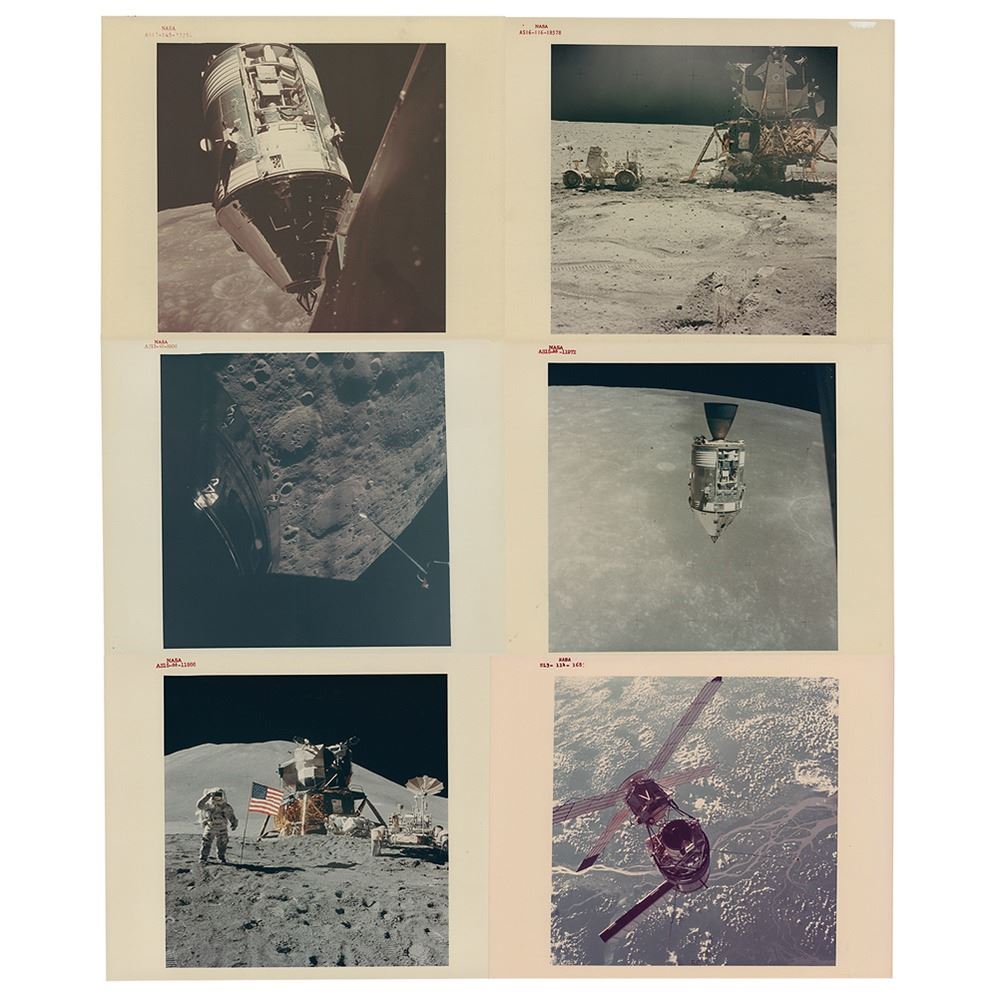 Group lot of six original vintage color glossy 10 x 8 red-numbered NASA photographs documenting events from various missions of the Apollo Program. The images are as follows: AS13-62-8908, the cratered lunar surface as viewed from the Apollo 13 spacecraft; AS15-88-11866, CDR Dave Scott saluting the American flag during the Apollo 15 mission; the Command Module Endeavour floating above the moon as seen from the Lunar Module Falcon during Apollo 15; AS16-116-18578, Commander John Young working on the lunar rover during an Apollo 16 EVA; and AS17-145-22254, the CSM America right next to the LM Challenger while in lunar orbit during Apollo 17. Also included is SL3-114-1683, which offers a close-up view of the Skylab space station above Earth as taken during the Skylab 3 mission prior to docking. The reverse of the Apollo photos bear ‰ÛÏA Kodak Paper‰Û watermarks, and the reverse of the Skylab photo is marked ‰ÛÏThis Paper Manufactured by Kodak.‰Û In overall fine condition, with paper remnants to borders of the 15 and 16 photos, and annotations to reverse of the 17 photo.