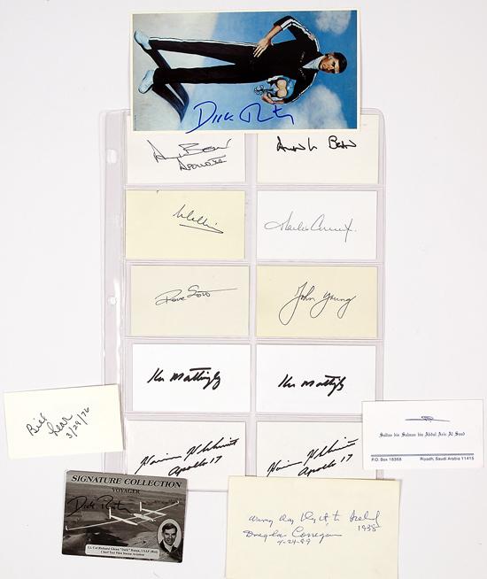Apollo Program, Astronaut Autographs. Lot of 10 autographs on business card-sized blank cards including Alan Bean (x2), Michael Collins, Charles Conrad, Ken Mattingly (x2), Harrison Schmitt (x2), Dave Scott and John Young. ALSO included are signed business cards of Shuttle astronaut Sultan Al Saud and aviator Bill Lear. A nice lot that includes some scarce autographs.