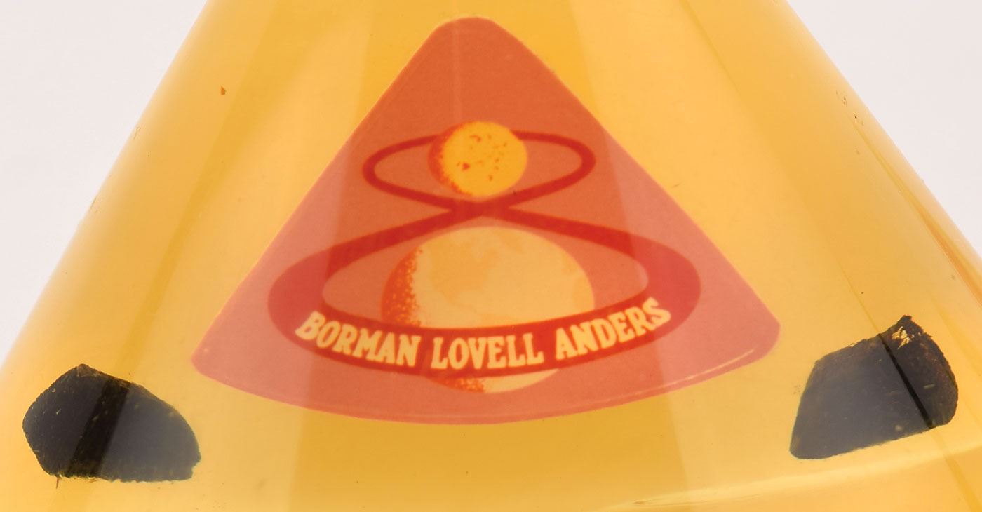 Unusual grouping of 10 capsule-shaped acrylic displays containing flown artifacts from nine Apollo missions: 7–14 and 16. Nine of the displays are similar in size and appearance, each measuring 3 x 2.25 x 1.5 and containing a mission emblem and two small pieces of a flown Apollo spacecraft, likely segments of ablative heat shield from a command module. The appearance and make of these displays indicate that they were done by North American Rockwell. Also included is an apparent flown heat shield fragment removed from the Apollo 7 spacecraft, approximately measuring 1.25 x 2 x .5, encased in a capsule-shaped 3.75 x 3 x 1.75 piece of Lucite with reverse bearing a North American Rockwell label commemorating the first manned Apollo mission. In overall fine condition.