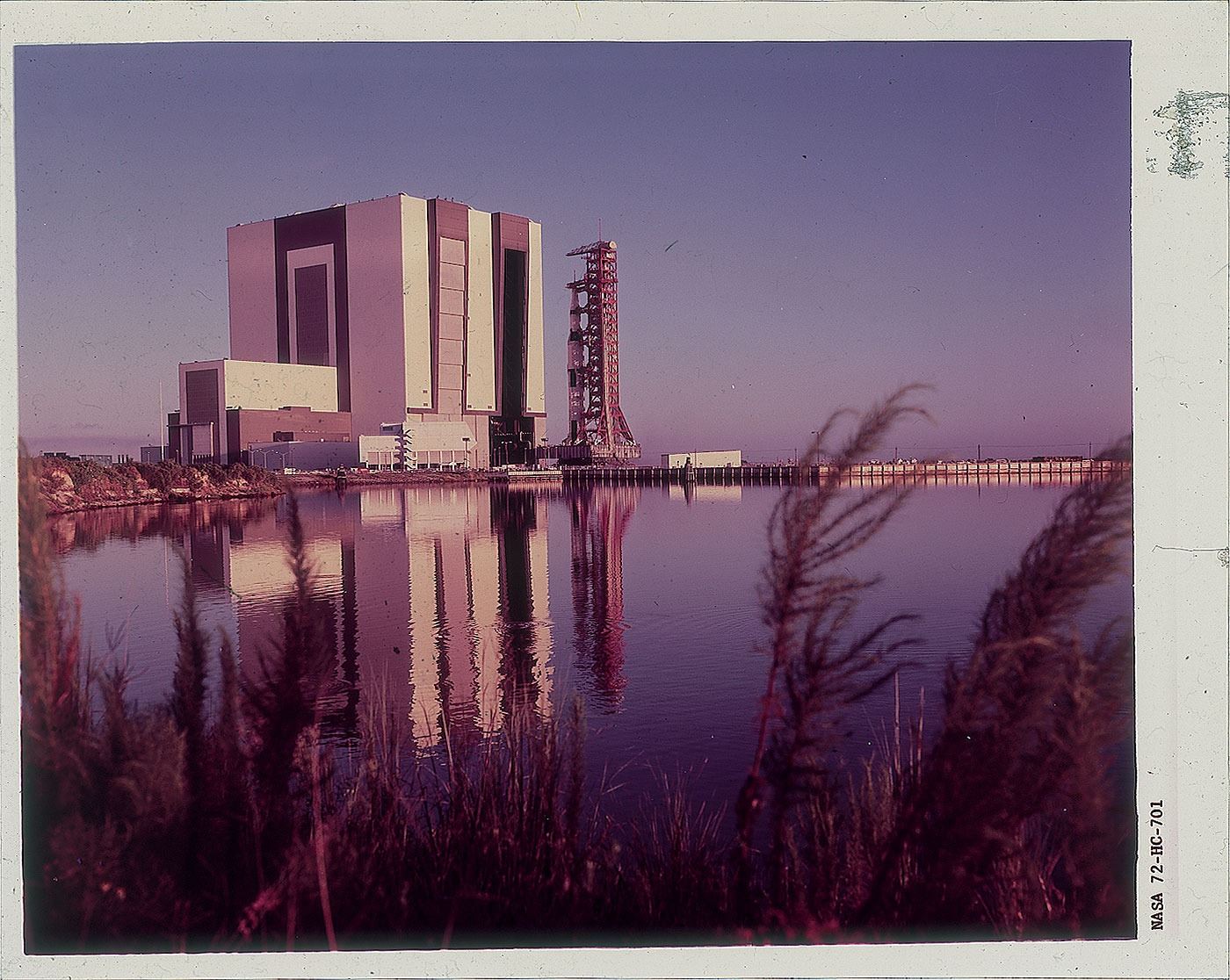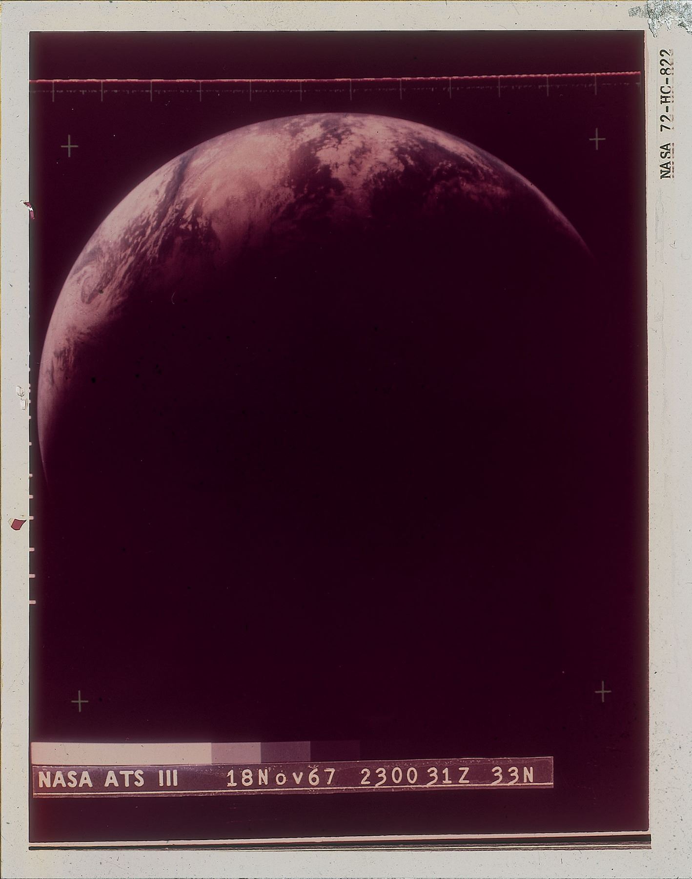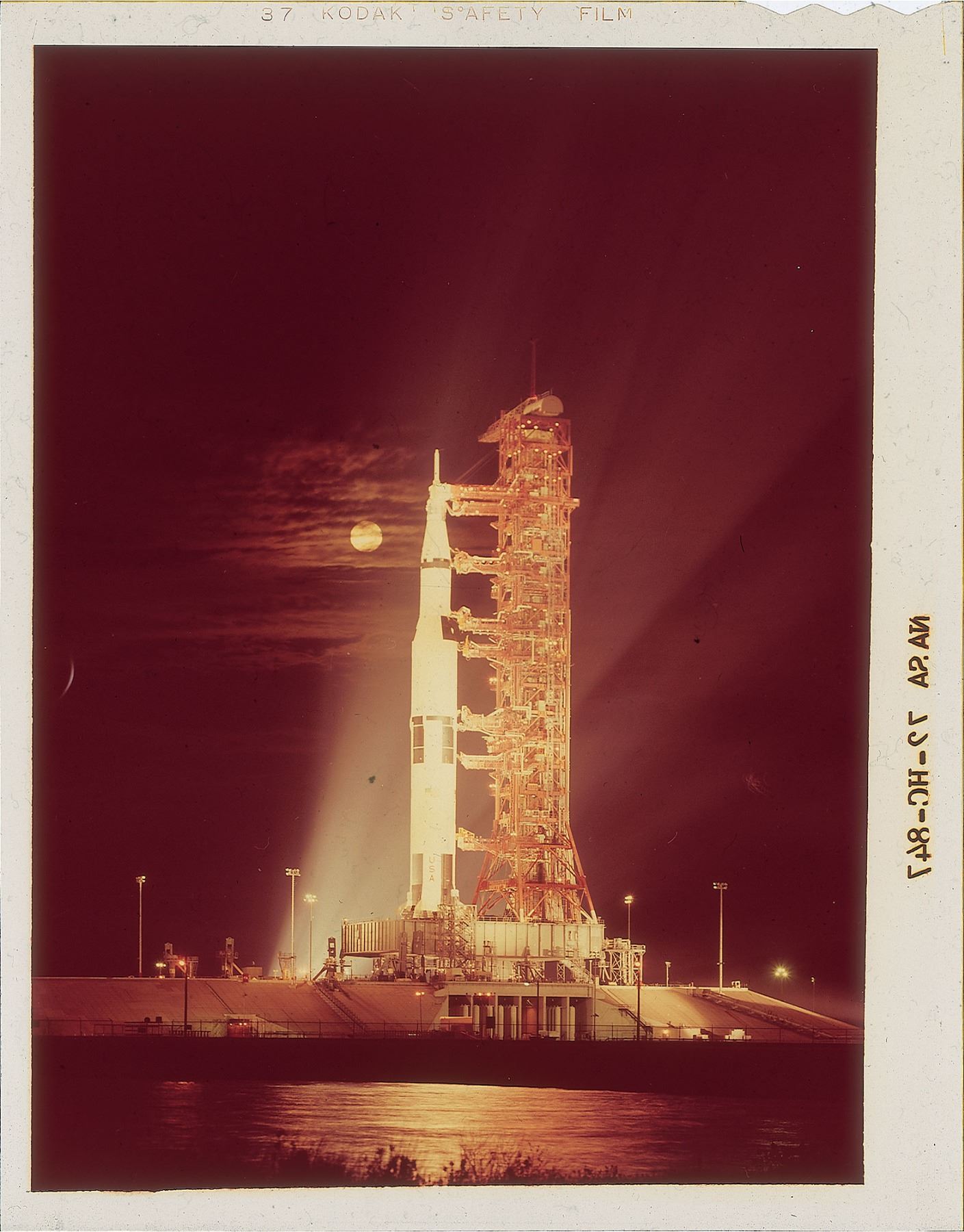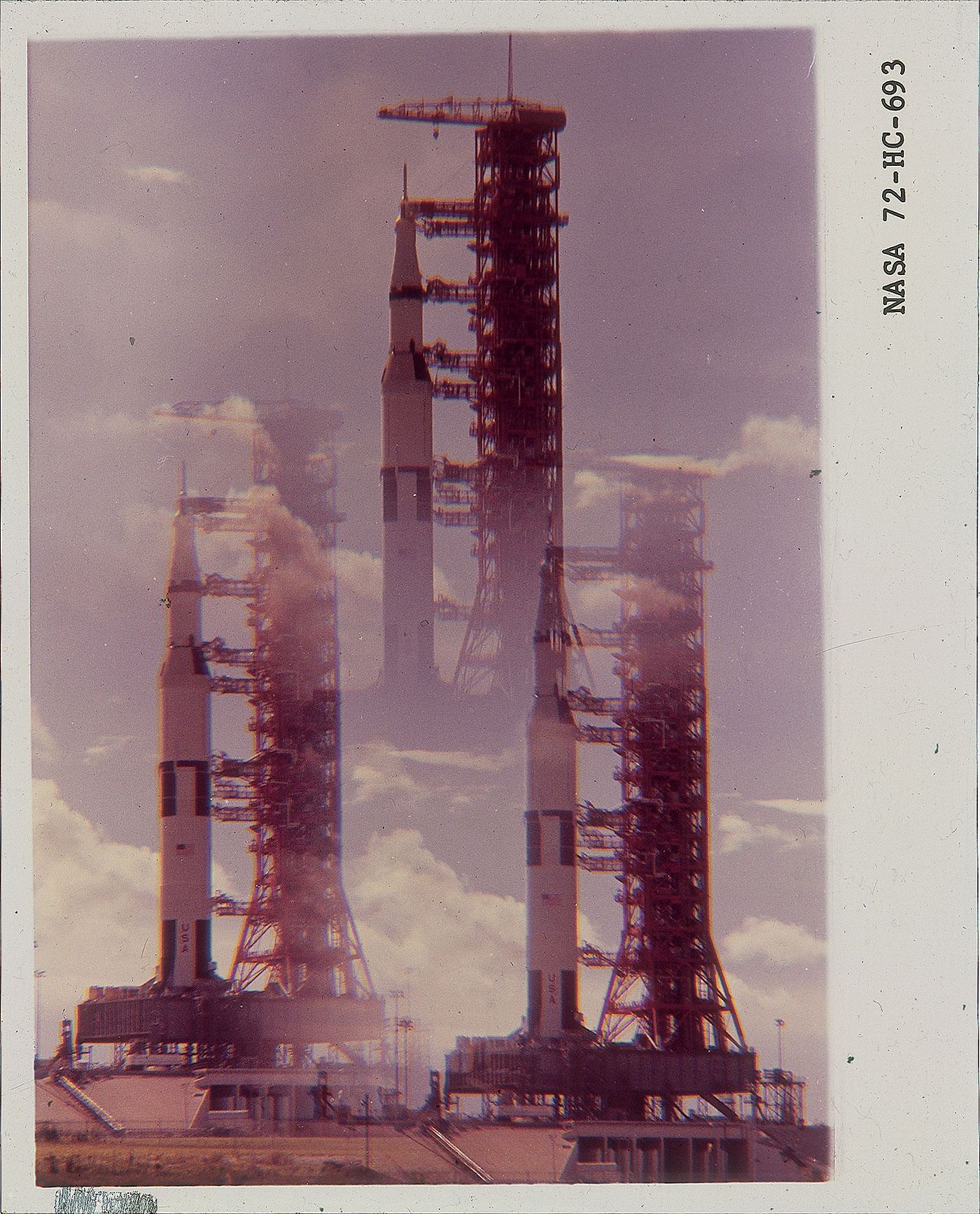 Four vintage official color NASA positive transparencies from the Apollo era, including: a 4 x 5 image of three Saturn V rockets with Launch Umbilical Tower, numbered "NASA 72–HC–693"; a 4 x 5 nighttime image of an illuminated Saturn V rocket on its launch pad, numbered: "NASA 72–HC–847"; a 5 x 4 image of a Saturn V rollout from the Kennedy Space Center, numbered "NASA 72–HC–701"; and a 4 x 5 image of a shadowed Earth as taken by the Applications Technology Satellite III (ATS) on November 18, 1967, numbered "NASA 72–HC–822." In overall fine condition.