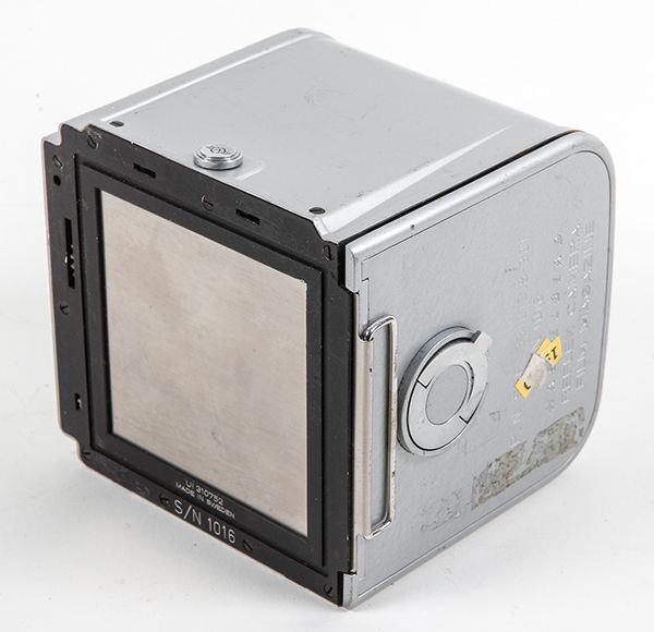 Apollo Program, Hasselblad 70mm. Silver Film Magazine (3.25.x3.5x3.25") ID No. P/N SEF 33101018-301, S/N 1016. This film magazine has a magazine slide and two white velcro tape patrches on one end. Used, but good overall condition. This is the type of Hasselbad magazine used by the astronauts on the lunar surface as the silver color reflected heat better than the original dark leather magazine cover. An important find.