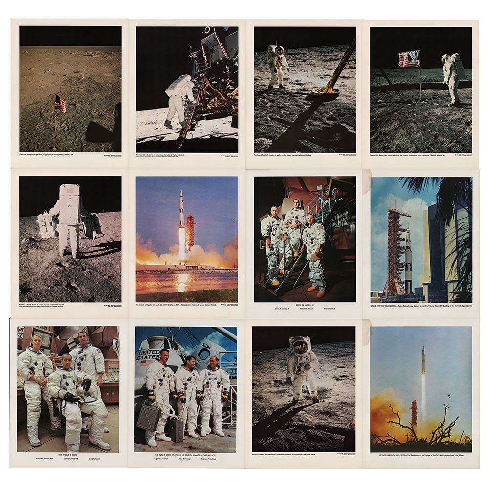 Large group of 24 official color 11 x 14 NASA lithographs of early Apollo crews and views from the collection of Otto Berg. Includes: crew portraits of Apollo 7, 8, 9, 10, and 11; the iconic Apollo 8 'Earthrise' image; various Apollo liftoffs; several iconic Apollo 11 images, including Neil Armstrong and Buzz Aldrin deploying the flag on the lunar surface, Aldrin at the foot of the Lunar Module 'Eagle,' Aldrin with the American flag at Tranquility Base, the classic 'visor' shot of Aldrin walking on the moon, the LM during its ascent with Earth in the background, and other great images from the mission. Housed in their original NASA envelope. In overall very good to fine condition, with dampstaining to borders of several lithos.