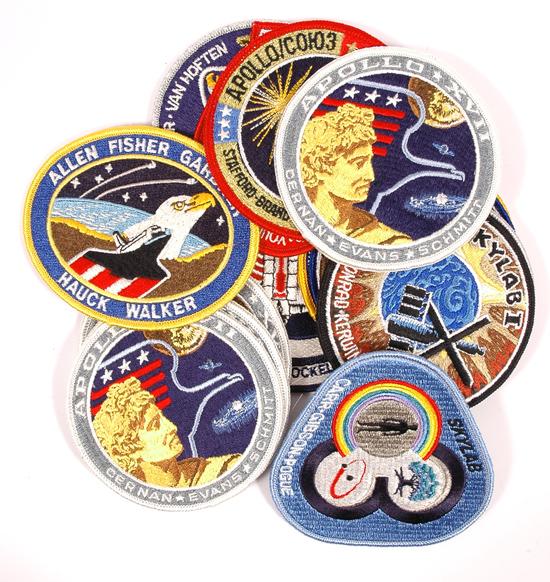 Apollo Program, c1960s, Apollo Crew Patches. Lot of 12 different 4" patches (Apollo 13-16, 17 (x5)) plus an ASTP patch, two different Skylab patches and five different Shuttle patches. There were saved by a former North American Rockwell employee who worked in Downey, CA during the Apollo years. An attractive lot.