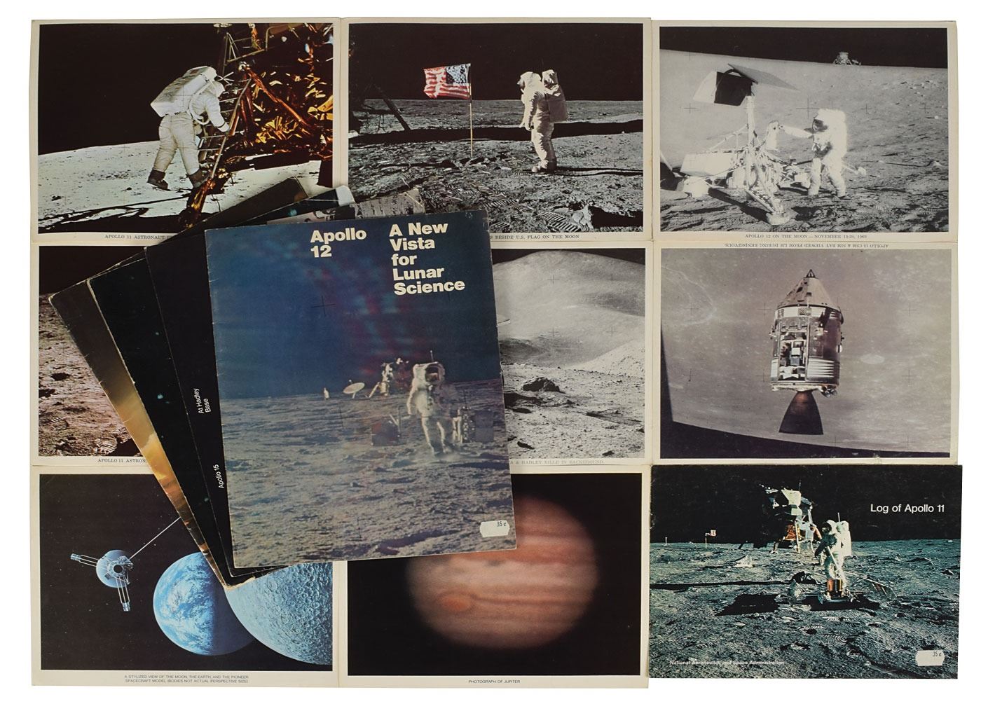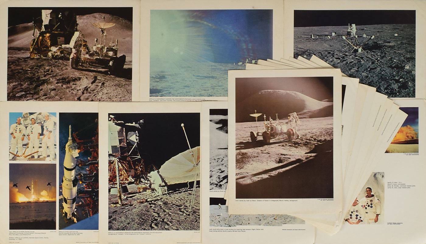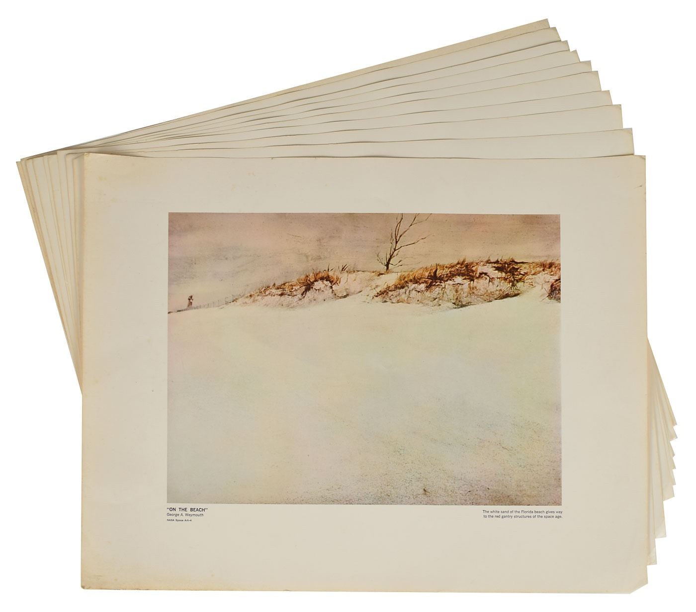 Collection of official NASA materials from the Apollo era, including: six 10 x 8 lithographs of images from the Apollo missions; two 10 x 8 lithographs related to the Pioneer probe sent to Jupiter; booklets about Apollo 11, 12, 15, 16, and 17; fifteen 11 x 14 lithographs of images from the Apollo missions, including several composites; and twelve 20 x 16 lithographs of NASA 'Space Art' inspired by the American space program, with artists including Paul Calle, James Wyeth, Fred Freeman, Peter Hurd, George A. Weymouth, and others. In overall very good to fine condition.