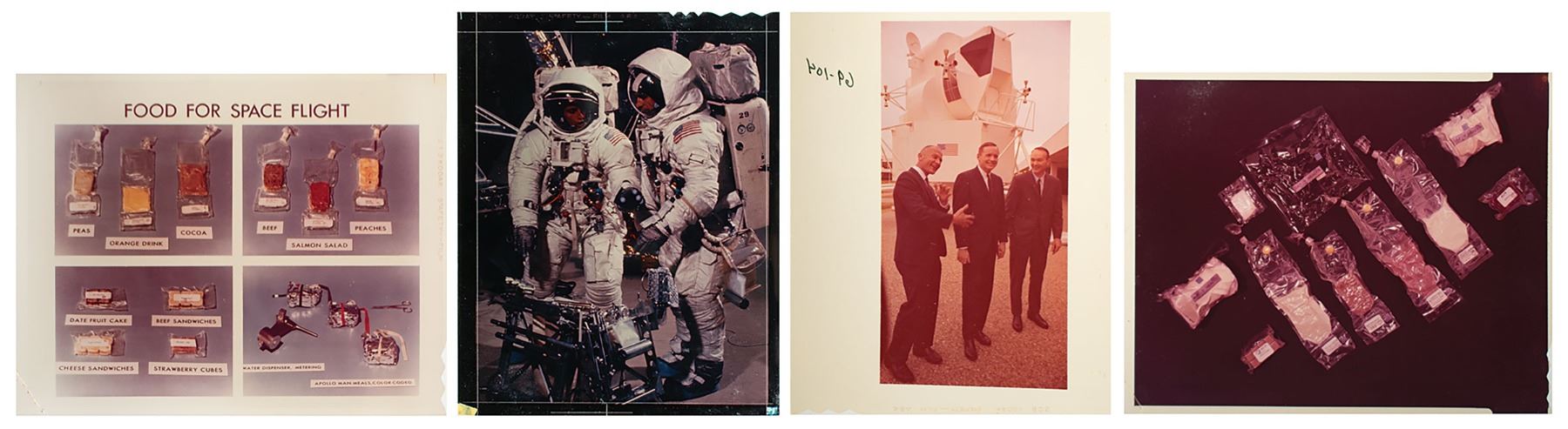 Four color 4 x 5 positive transparencies, with subjects including: the Apollo 11 crew of Neil Armstrong, Buzz Aldrin, and Michael Collins posing in suits in front of a mock Lunar Module; Apollo 12 crewmen Alan Bean and Charles Conrad during training for their lunar EVA; a layout of the specially prepared space food developed for the Apollo program; and a composite image of four layout shots of Apollo space food. Includes official NASA caption sheets for the two space food images. In fine condition.
