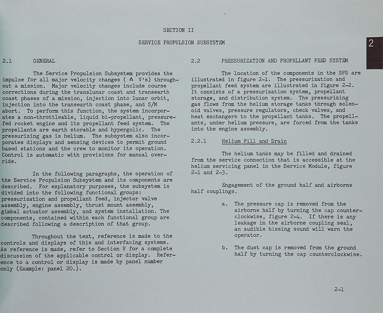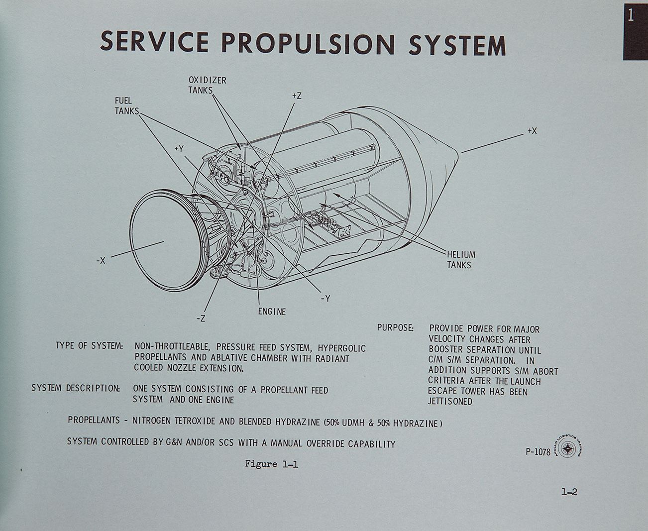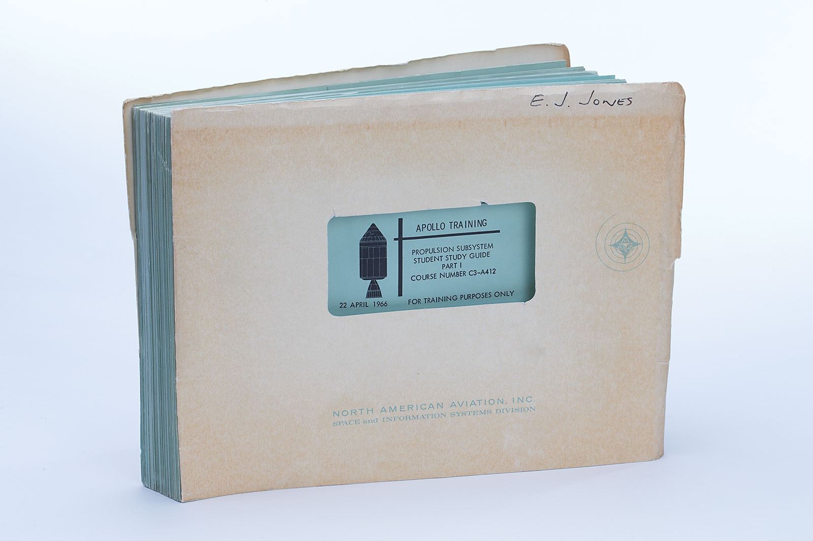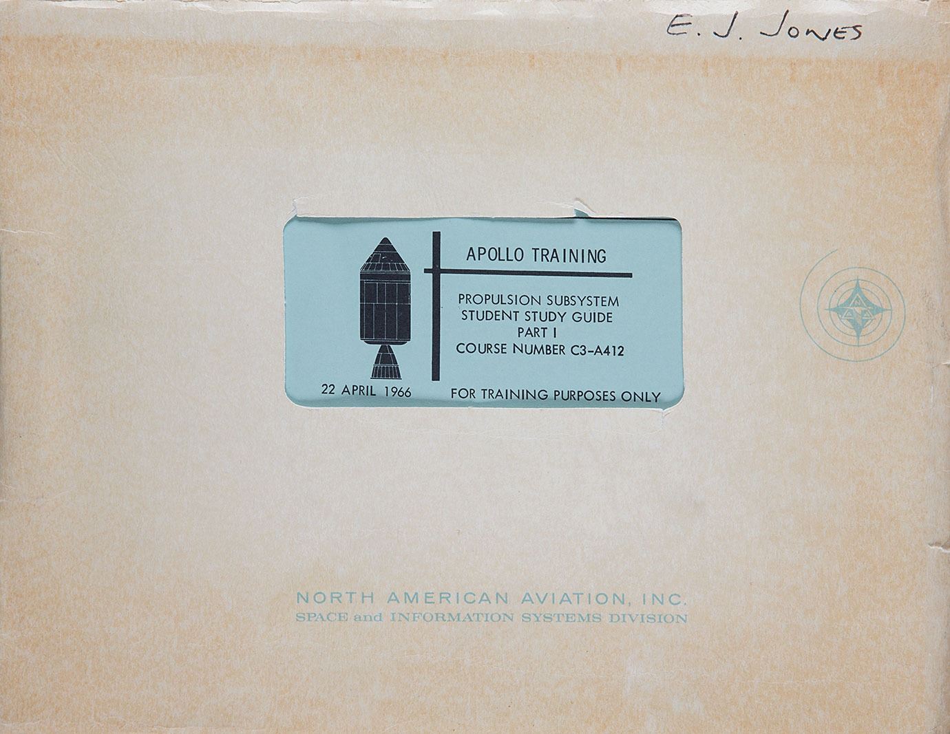 Thick North American Aviation training manual for the Apollo Command/Service Module Propulsion Subsystem, issued on April 22, 1966. The title page depicts the CSM and reads: "Apollo Training: Propulsion Subsystem, Student Study Guide, Part I, Course Number C3-A412." The manual contains 'slides' detailing the propulsion system with illustrations, diagrams, and text, covering the Service Propulsion System and Reaction Control System, as well as its displays and controls. In very good condition, with an ownership notation to the cover ("E. M. Jones"), toning and edgewear to wrappers, and creasing to title page. An interesting manual which offers a comprehensive overview of the Apollo Command/Service Module's propulsion systems.