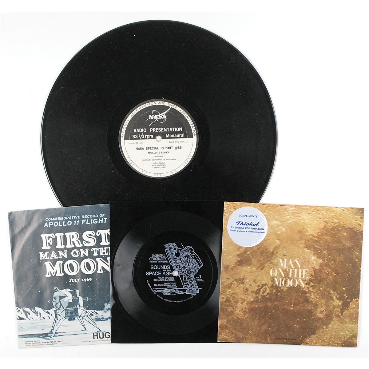 Collection of four records, 33 and 45 rpm, all regarding various Apollo missions. Titles are: First Man on the Moon narrated by Hugh Downs; National Geographic’s Sounds of the Space Age; Man on the Moon (Thiokol); and NASA Special Report #86, Apollo 16 Review. In fine condition.