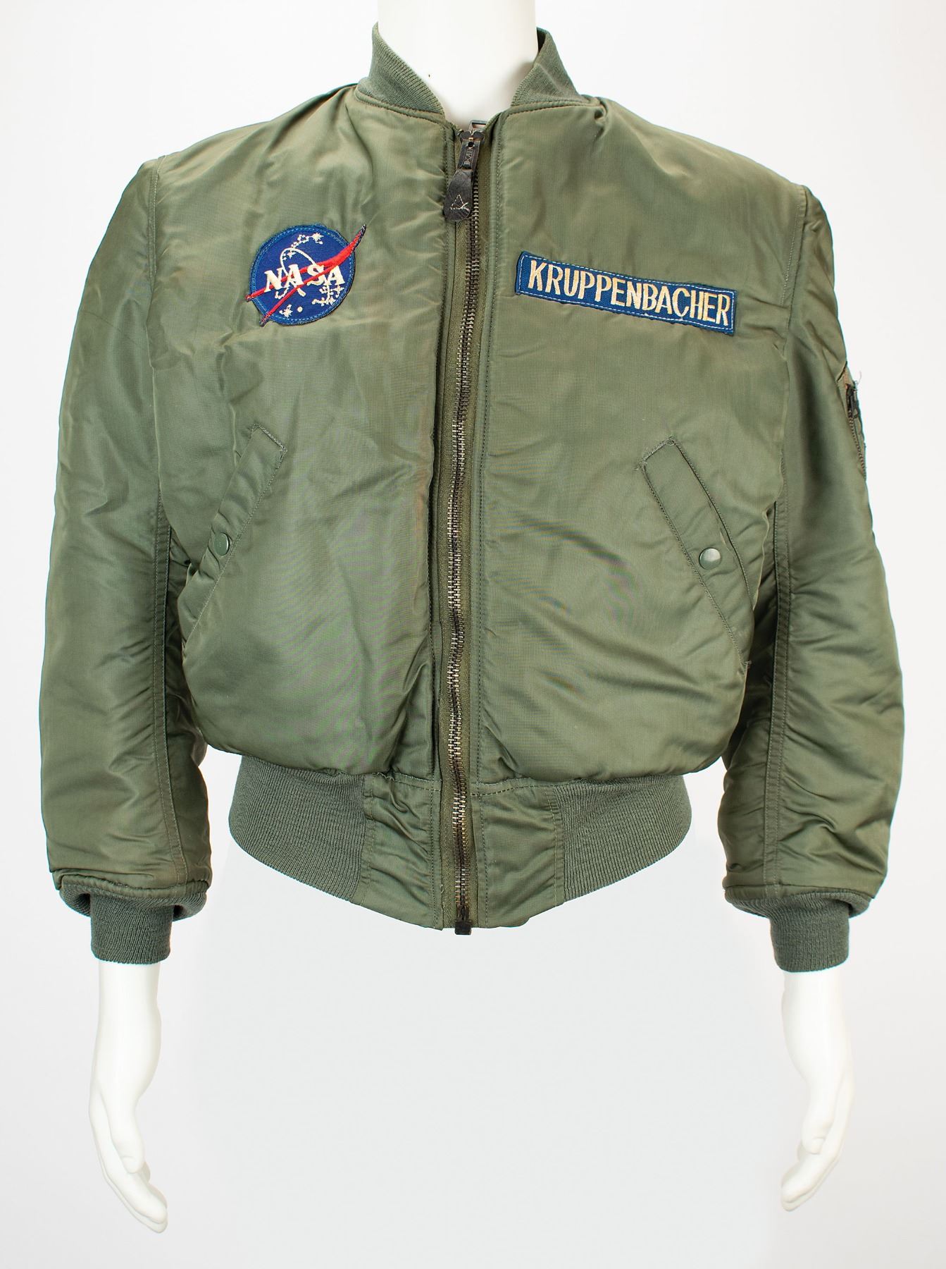 Dark green USAF flight jacket from the personal collection of Paul Kruppenbacher, a member of the NASA Houston Landing and Recovery Division who trained Apollo astronauts in water recovery procedures and was deployed on U.S. Navy aircraft carriers for crew and spacecraft recovery operations. The jacket boasts an embroidered NASA 'meatball' patch on the right chest, and a white-on-blue name patch, "Kruppenbacher," on the left. It is lined in bright orange and features two interior pockets, with two additional pockets on the front. It also has a zippered pouch on the left sleeve. In fine condition. Kruppenbacher notes that this was issued to him by NASA in support of Apollo spacecraft recovery operations. It was required for and used by him for USN operations onboard their aircraft carriers and aboard USAF C-133 aircraft, the latter which transported Command Modules from the receiving ports (Norfolk, VA and Pearl Harbor, HA) to CONUS sites for postlanding analysis.