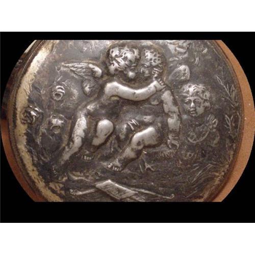 This dates pre-1900. The underside of the piece is marked with a fleur de lis and Apollo Silver Company - quadruple plate - and 756. LOVELY repousse cherubs are hugging and sitting around what looks like an arrow. The sides are also repousse and the pretty fancy feet are the nicest finishing touch. This is very old, has not been cleaned and has lots of dark patina on it. No dings or dents. Probably would have been a vanity item such as a trinket box. It measures 3" wide and 2 1/2" tall.
