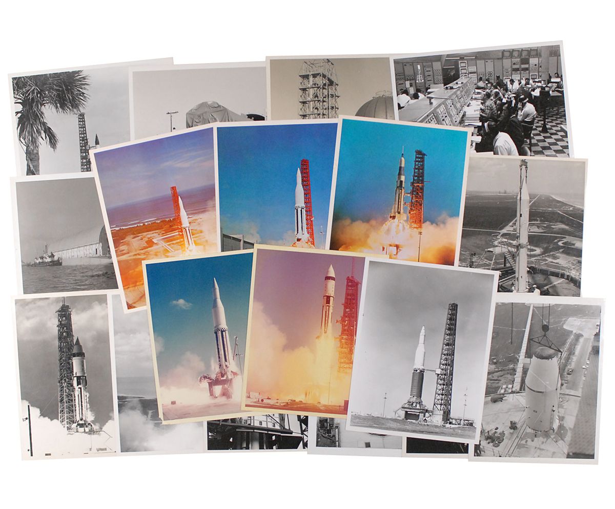 Collection of 21 hard-to-find vintage official NASA photos (18 glossy and 3 lithographs), 8 x 10 and 10 x 8, most showing the Saturn rocket on the launch pad or during liftoff, with a few of mission control and transport. In overall fine condition.
