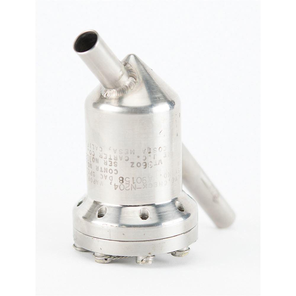 Apollo Saturn check valve, measuring approximately 4.5Ë x 4.5Ë x 2.25Ë, etched on the body: "Valve, Check, N2O4, Vapor, GN2, Assy No. A90158 DAC Spec 1A79530-501…Contr. No. NAS 7-101…Ser. No. 1029, Date 3/66." The central diagonal tube is marked to indicate direction of flow. In fine condition.