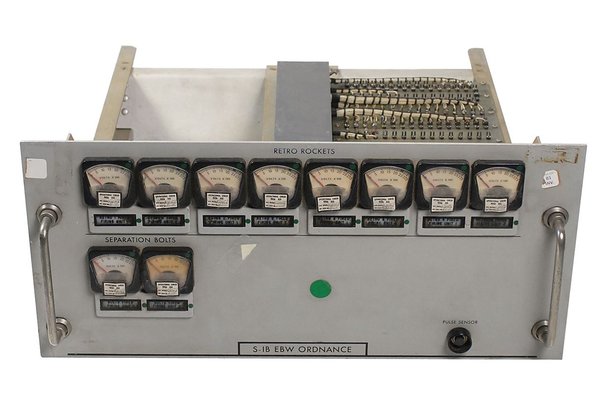 Apollo Saturn IB Launch Vehicle ordnance panel, 19 x 18 x 9, with its circuits and wiring present, used to monitor the retro rockets and separation bolts, with a pulse sensor button in the lower right. Panel has ten volt gauges, each with a small NASA operational check label affixed at the bottom. NASA label reads, “SIB EBW Ordnance, Assy. No. 40M03516-3, Contr. No. NAS8-25155; Serial No. 0004; Mfd by GFE.” In fine condition.