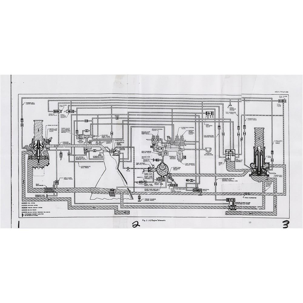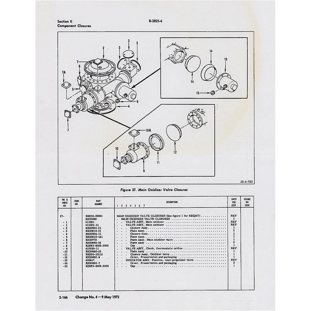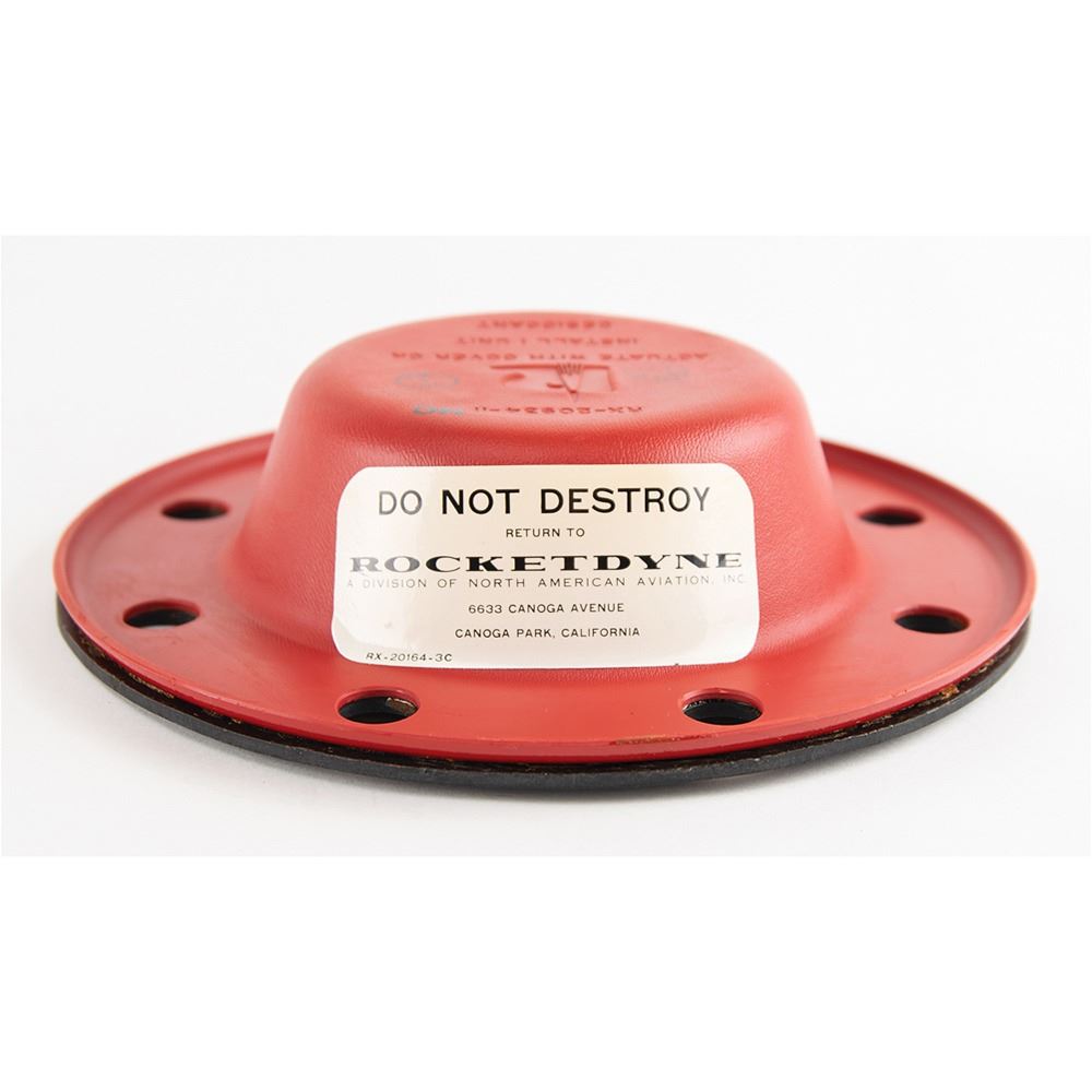 Protective closure assembly for the Rocketdyne J-2 rocket engine's oxidizer valve, measuring 8è in diameter and 2è tall, marked on the top with the Rocketdyne logo and part no. "RX-20934-11NC." Contained in its plastic packaging with cleaning tag dated November 21, 1967. Accompanied by the original parts list and diagram showing the location of the closure on the J-2 engine; its purpose was to provide better protection for the valve and reduce the possibility of foreign objects entering it during handling and use. The J-2 was a liquid-fuel cryogenic rocket engine used on NASA's Saturn IB and Saturn V launch vehicles.