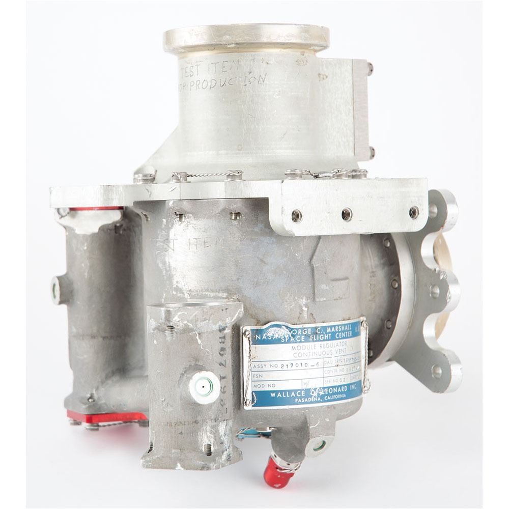 Apollo Saturn V Third Stage Continuous Vent Regulator Module made by Wallace O. Leonard Inc., measuring 7.75è x 9.25è x 7è, with a NASA George C. Marshall Space Flight Center plate at center: "Module Regulator, Continuous Vent, Assy No. 217010-6, DAC Spec. 1B51753-511U, Contr. No. NAS7-101, Ser No. 021, Date 7-68."