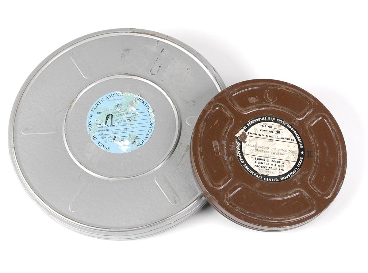 Two original canisters of 16mm color film. First canister measures 10.75? in diameter, and contains one reel of film. Rockwell Corporation label affixed to the cover reads, in part: “The Saturn S1…May 1968.” Second canister measures 7.25? in diameter and contains one reel of film. NASA label affixed to the cover reads, “Apollo-Saturn 202 Quick Look.” In fine condition.
