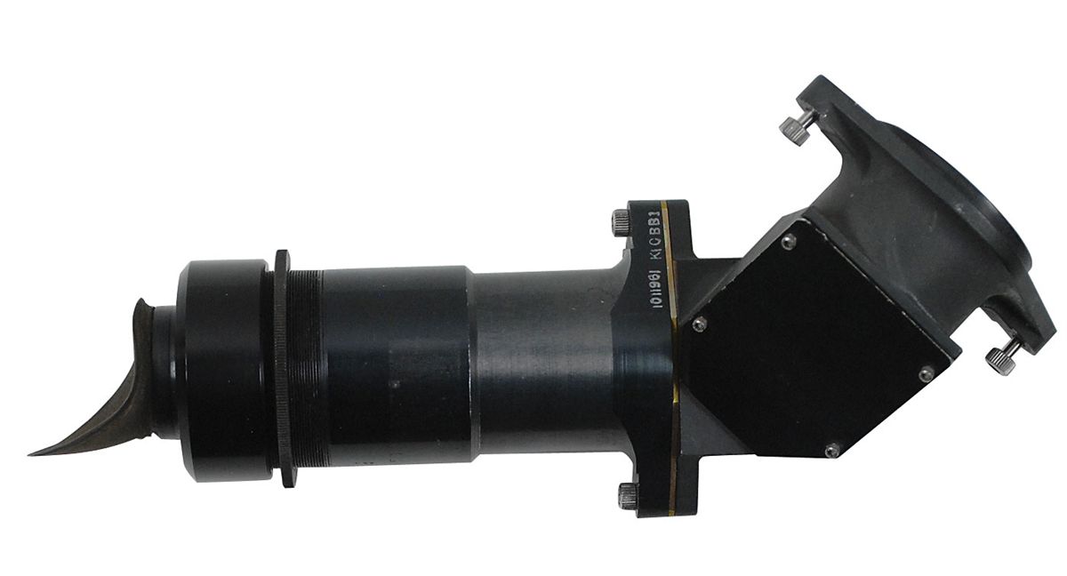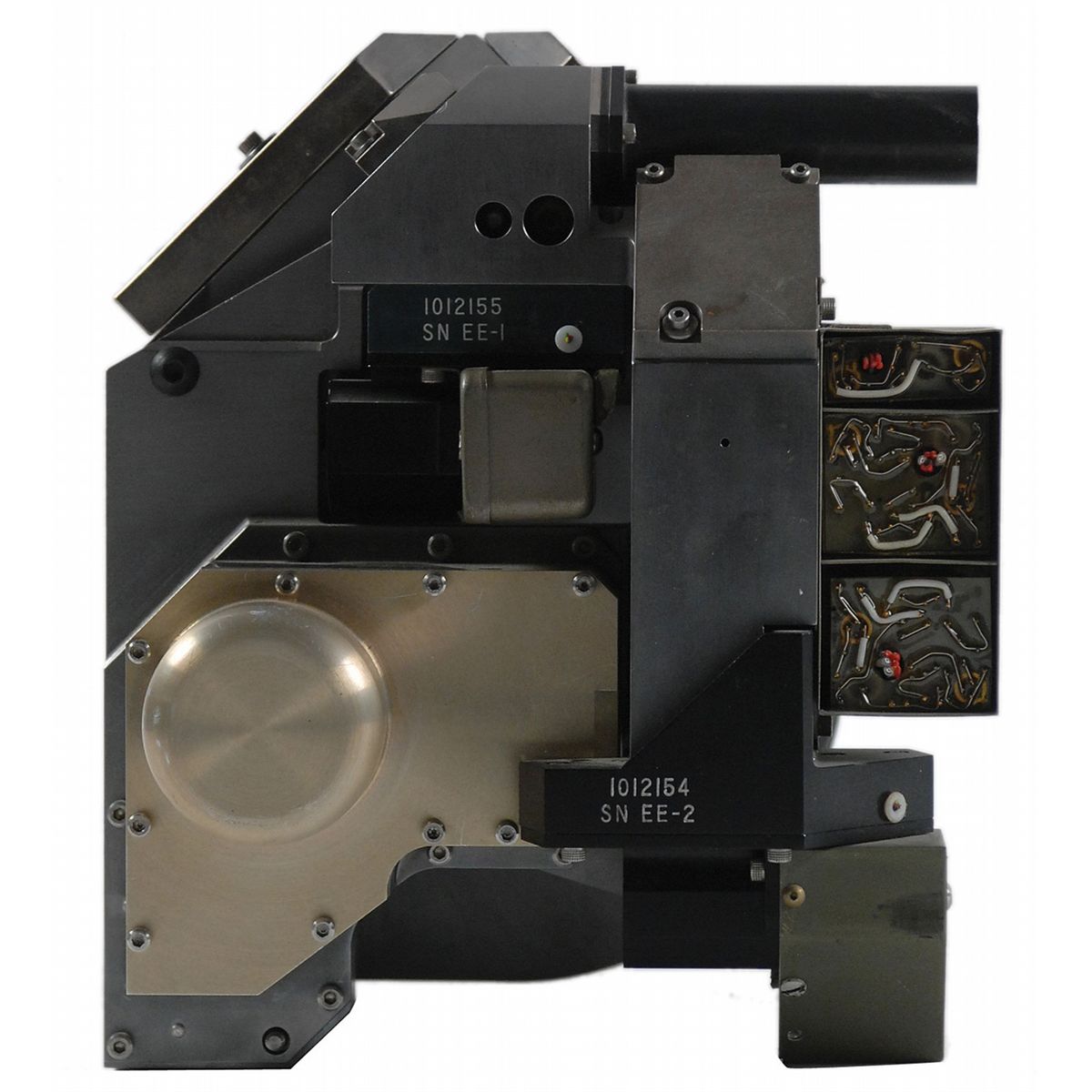 Scarce unflown Block II Apollo sextant. Metal cased unit measures approximately 7 x 6 x 6, with parts having serial numbers SN EE-1 and SN EE-2. The sextant was used with its counterpart (the scanning telescope) to determine the Command Module’s position and attitude with relation to stars or landmarks. This data was then supplied to the onboard computer to calibrate the spacecraft’s Inertial Measurement Unit (IMU). The sextant was a highly accurate optical device capable of measuring the included angle between two targets. Angular sightings of two targets were conducted through the fixed beam splitter and movable mirror located in the sextant head. The sighting head assembly is rotatable to 270 degrees in shaft axis position in either direction, from the zero reference point. The sextant lens provides 1.8-degree true field of view with 28X magnification. The movable mirror is capable of sighting a target to 57 degrees line of sight from the shaft axis. Both the fixed and moveable mirrors are fabricated of beryllium; the beryllium is Kanigen coated and aluminized to obtain maximum reflectivity. The sextant target optics include an indexing mirror assembly and a beam splitter, telescope, and eyepiece assembly.