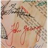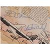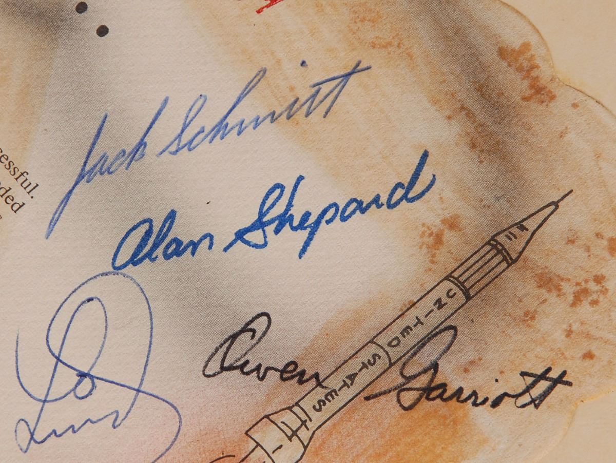 Vintage color placemat entitled ‘The Story of Flight,’ 13.75 x 9.75, signed in felt tip and ballpoint by 25 astronauts, including: Alan Shepard, John Young, Charles Conrad, Jim Irwin, Dave Scott, Harrison Schmitt, Alan Bean (2), Gene Cernan, Charlie Duke, Edgar Mitchell, Stu Roosa, Rusty Schweickart, Al Worden, Fred Haise, Richard Gordon, Bruce McCandless, Paul Weitz, Vance Brand, Owen Garriott, Joe Engle, Don Lind, Joe Kerwin, Bill Pogue, Story Musgrave, and Ed Gibson. Affixed to a larger scrapbook page. In very good condition, with overall show-though from toned adhesive. These autographs were obtained by a longtime employee of ILC Industries in Dover, Delaware, which has developed space suits for NASA since the Apollo era.