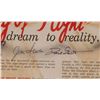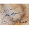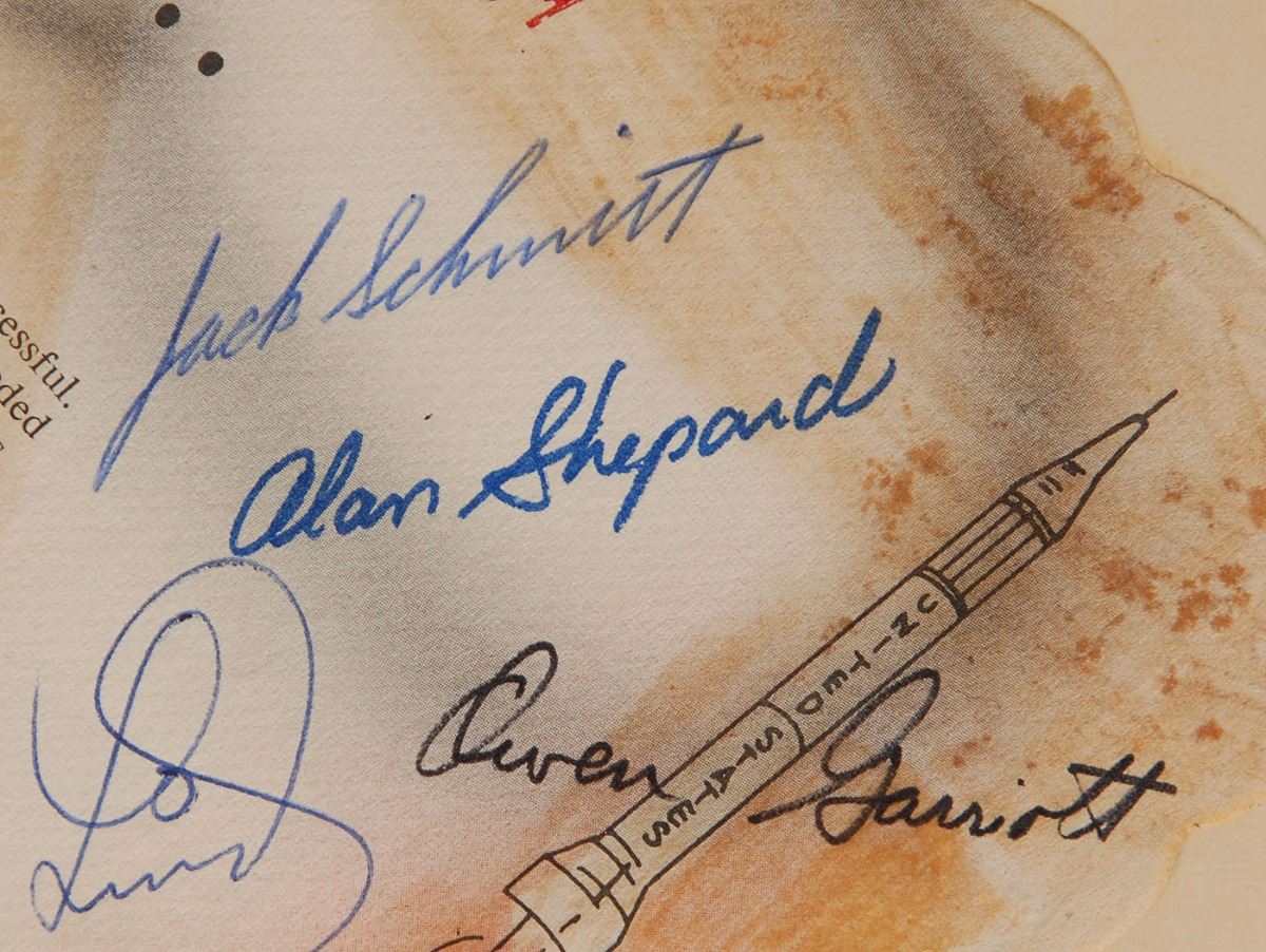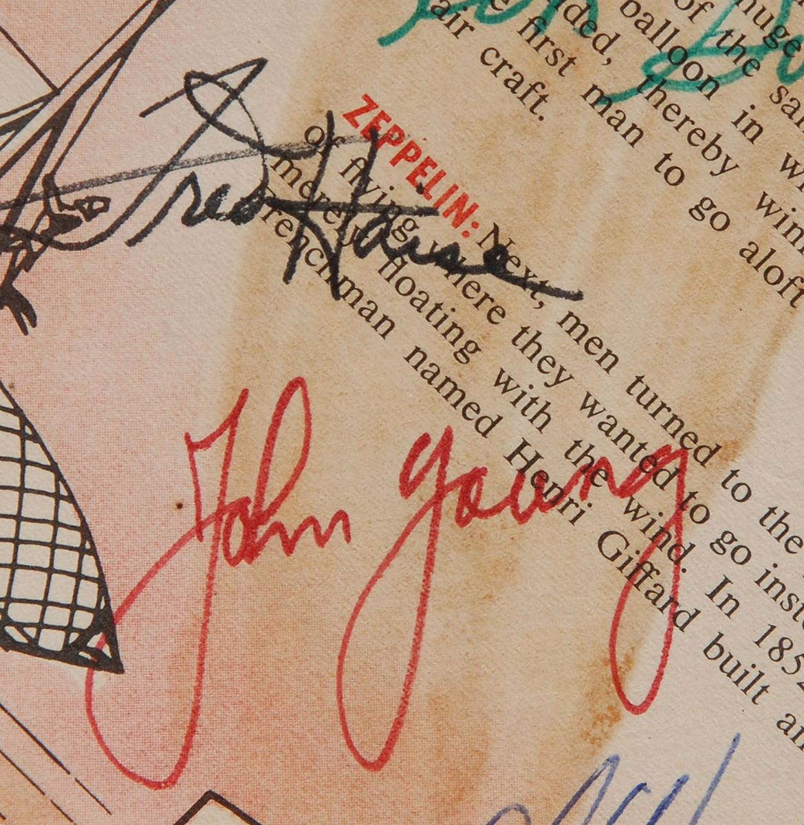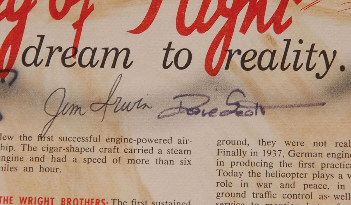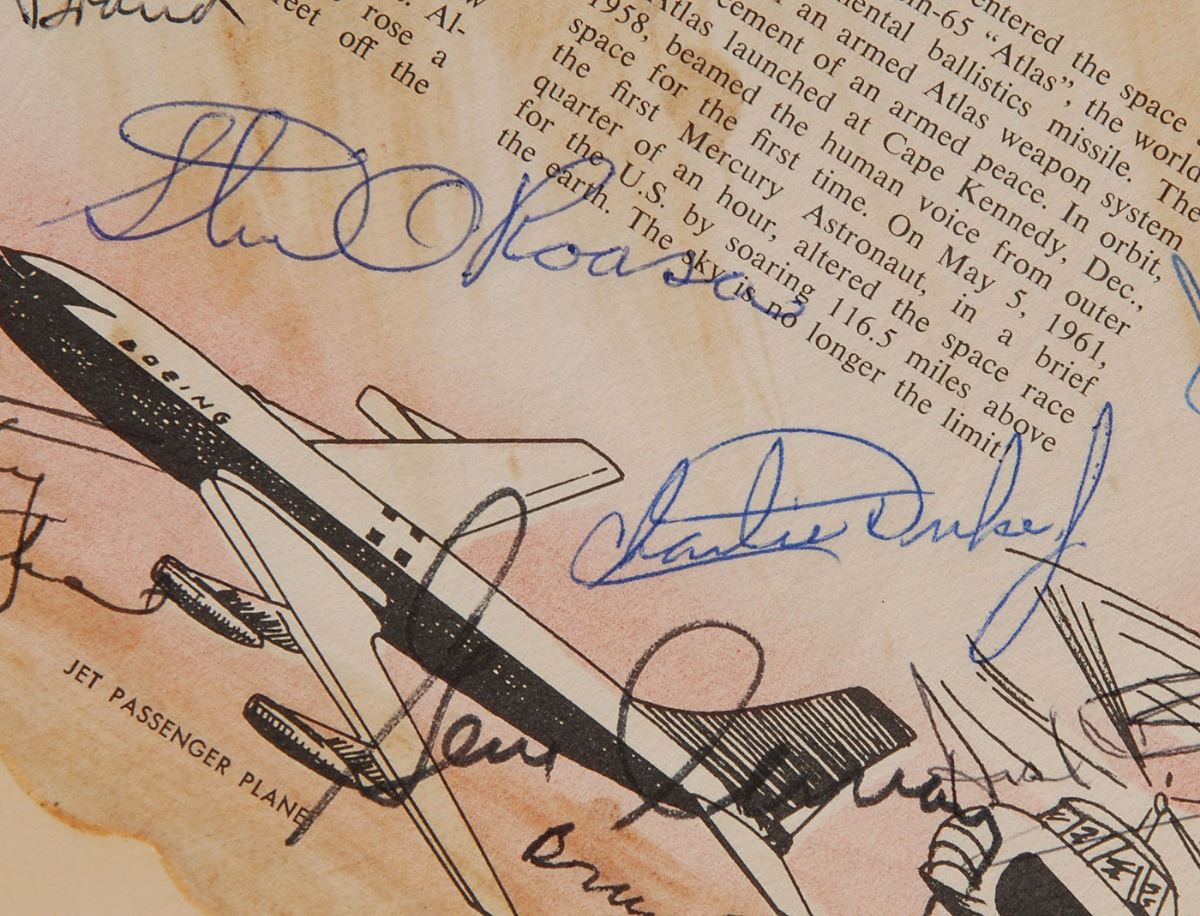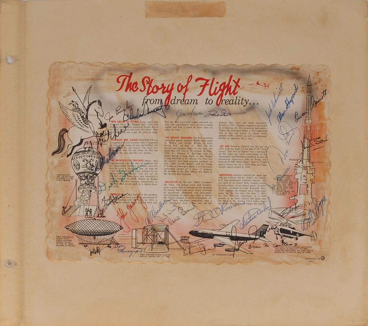 Vintage color placemat entitled 'The Story of Flight,' 13.75 x 9.75, signed in felt tip and ballpoint by 25 astronauts, including: Alan Shepard, John Young, Charles Conrad, Jim Irwin, Dave Scott, Harrison Schmitt, Alan Bean (2), Gene Cernan, Charlie Duke, Edgar Mitchell, Stu Roosa, Rusty Schweickart, Al Worden, Fred Haise, Richard Gordon, Bruce McCandless, Paul Weitz, Vance Brand, Owen Garriott, Joe Engle, Don Lind, Joe Kerwin, Bill Pogue, Story Musgrave, and Ed Gibson. Affixed to a larger scrapbook page. In very good condition, with overall show-though from toned adhesive. These autographs were obtained by a longtime employee of ILC Industries in Dover, Delaware, which has developed space suits for NASA since the Apollo era. Pre-certified Zarelli Space Authentication.