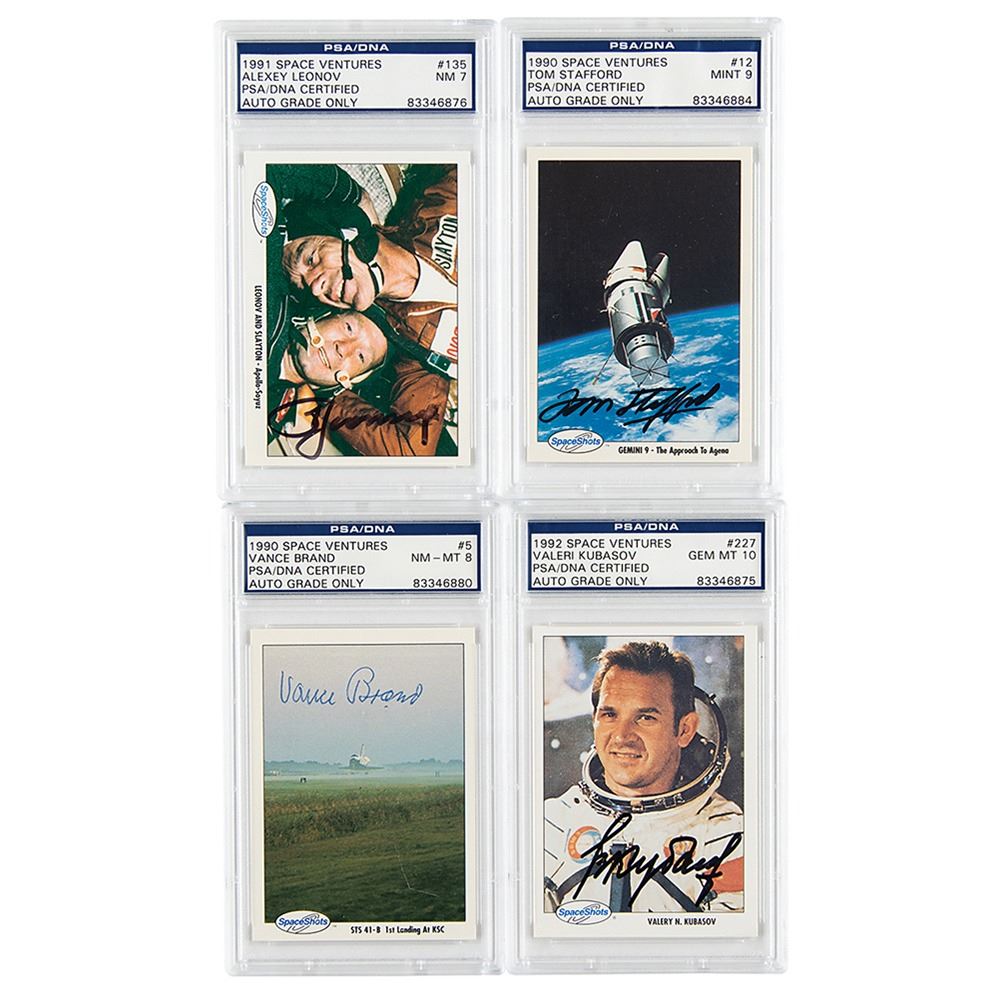 Group lot of four Space Shots trading cards, each signed on the front in ink or felt tip by an astronaut or cosmonaut from the Apollo-Soyuz Test Project, all of which are encapsulated in PSA/DNA authentication and grading holders. The astronauts include Vance Brand (NM-MT 8), Valery Kubasov (GEM MT 10), Alexei Leonov (NM 7), and Tom Stafford (MINT 9). In overall fine condition.