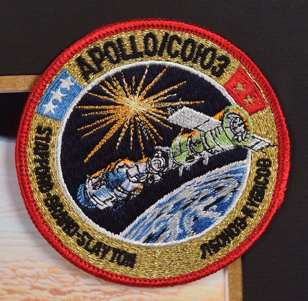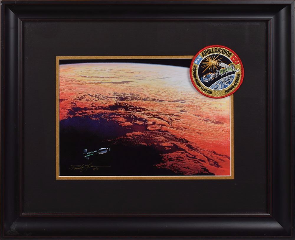 Deke Slayton's flown embroidered Apollo–Soyuz Test Project mission patch carried aboard the Apollo CSM-111 for nine days in space, measuring 4? in diameter, and affixed to an attractive color 13 x 8.75 print depicting the two docked spacecraft floating high above the Earth's surface, signed in the lower left in gold ink by the artist, "Pamela Lee, 8/10." Archivally double-matted and framed to an overall size of 22 x 17.75. In fine condition. Accompanied by a certificate of authenticity signed by his wife, Bobbie Slayton, which reads in part: "This is to certify that this Apollo Soyuz crew patch belonged to my husband, Deke Slayton, and was flown on that mission in 1975. It was locked in his safe deposit box along with other flown memorabilia."