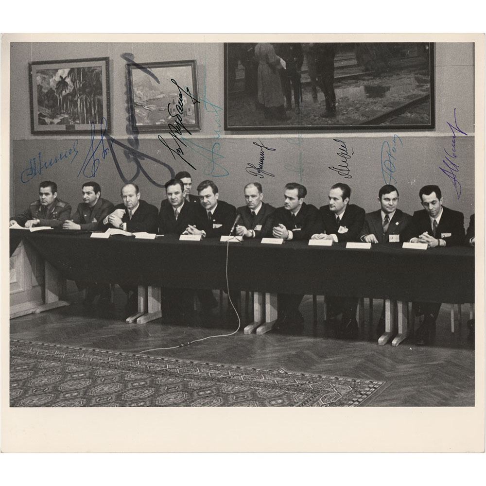 Uncommon matte-finish 9.25 x 8 photo of the Soviet team of cosmonauts seated together at a press conference for the Apollo-Soyuz project, signed in various colored ink types by all 10 pictured: Andriyan Nikolayev, Valery Bykovsky, Alexei Leonov, Valeri Kubasov, Anatoly Filipchenko, Nikolai Rukavishnikov, Vladimir Dzhanibekov, Boris Andreyev, Yuri Romanenko, and Alexander Ivanchenko. In fine condition.