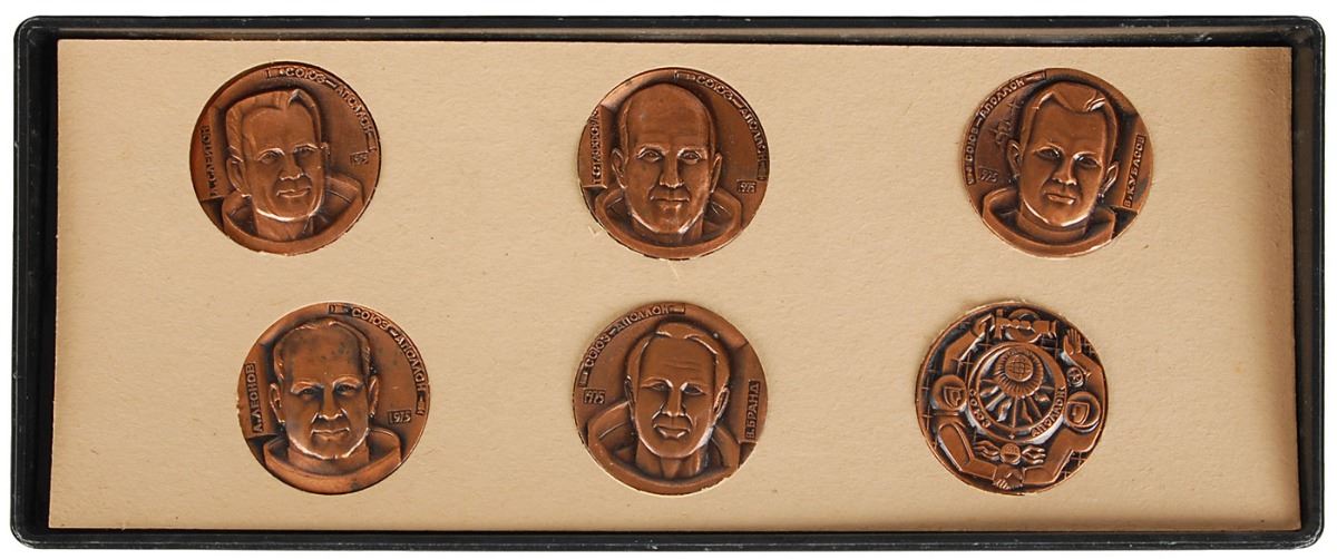 Rare set of six Apollo-Soyuz medals gifted to Jack King, a former Chief of Public Information and Public Affairs Officer for NASA. Each bronze-colored medal measures 1.5? in diameter and features individual raised portraits of the three Apollo astronauts—Tom Stafford, Vance Brand, and Deke Slyaton—the two Soyuz cosmonauts—Alexei Leonov and Valeri Kubasov—and a stylized logo symbolizing the moment of docking, with all but the latter bearing engraved signatures of the respective astronaut or cosmonaut on the reverse. Includes the original plastic case. In fine condition. Originating from the Astronaut Scholarship Foundation, a portion of the proceeds for the sale of this item will be donated to the ASF.