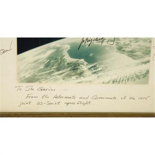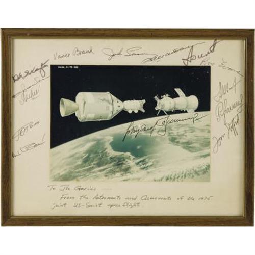 <B>Apollo-Soyuz Signed Color Docking Photograph,</B></I> 9.25" x 7" matted to 11.5" x 10.5", signed "<I>Tom Stafford,</B></I>" "<I>Vance Brand,</B></I>" "<I>D.K. Slayton,</B></I>" "<I>Alan L. Bean,</B></I>" "<I>Ron Evans,</B></I>" "<I>Jack Lousma,</B></I>" "<I>A. Leonov,</B></I>" "<I>V. Kubasov,</B></I>" "<I>A. Filipchenko,</B></I>" "<I>Rukavishnikov,</B></I>" "<I>V. Shatalov,</B></I>" "<I>A. Ivanchenko,</B></I>" "<I>Romanenko,</B></I>" and two others in Russian. Astronauts Stafford, Brand, and Slayton and cosmonauts Leonov and Kubasov were the Apollo/Soyuz Test Project crew. Bean, Evans, Lousma, Filipchenko, and Rukavishnikov were the back-up ASTP crew. Kubasov and Leonov signed on the photograph of a NASA artist's concept of the 1975 Apollo/Soyuz docking approach; the rest signed on the mat. The photo has faded a bit. Framed to 14.75" x 11.5". <I>From the collection of renowned former physical trainer of the astronauts Joe Garino. This lot is accompanied by a signed certificate of authentication from Garino verifying its provenance.</B></I><BR><BR><b>Shipping:</b> Framed - with Glass, Small (<a target="_blank" href="http://www.heritageauctions.com/common/shipping.php">view shipping information</a>)