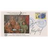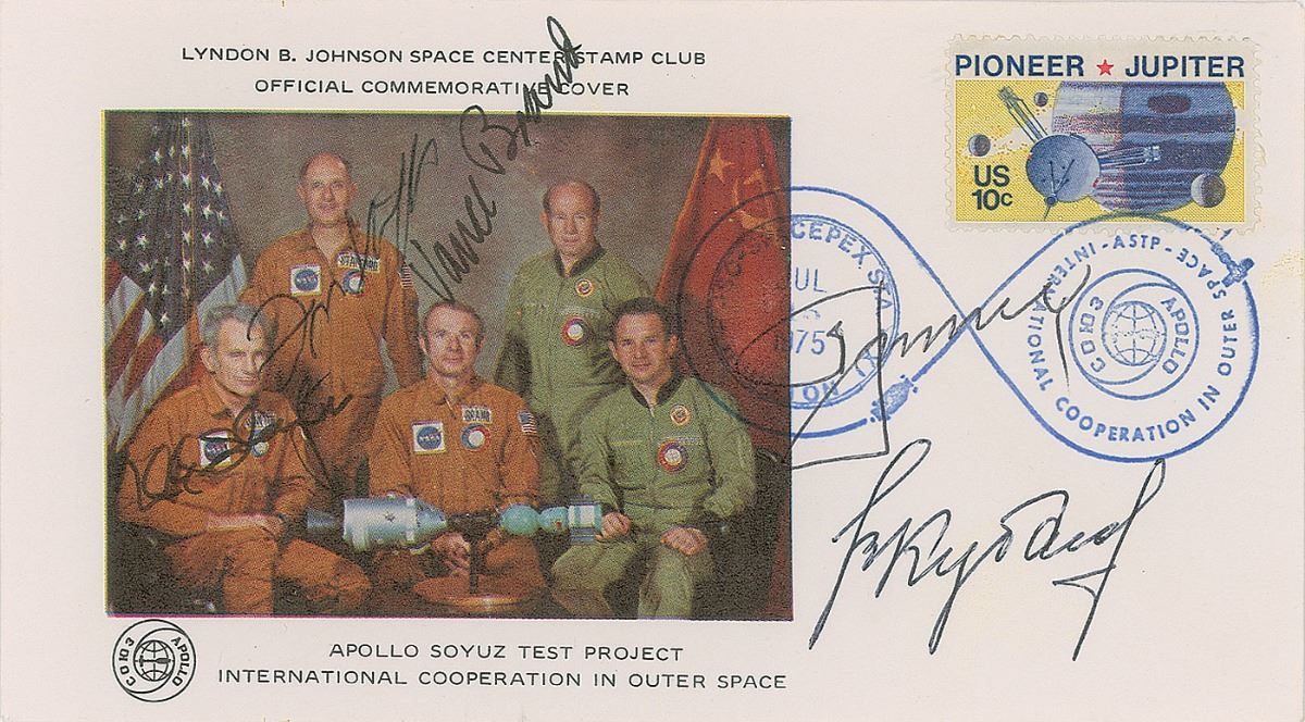 Lyndon B. Johnson Space Center Stamp Club official commemorative cover with a picture cachet honoring the crew of the Apollo Soyuz Test Project and International Cooperation in Outer Space, signed in black ink by Deke Slayton, Tom Stafford, and Vance Brand, and in black ballpoint by Alexei Leonov and Valeri Kubasov. In fine condition, with an ownership label affixed to reverse.
