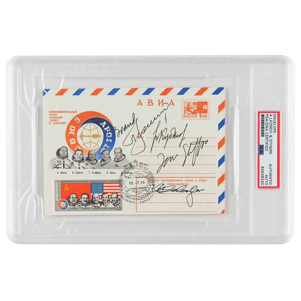 Soviet commemorative cover honoring the cooperative crew of the Apollo-Soyuz Test Project, signed in black felt tip by Tom Stafford, Deke Slayton, Vance Brand, Alexei Leonov, and Valeri Kubasov. In fine condition. Encapsulated in a PSA/DNA authentication holder.