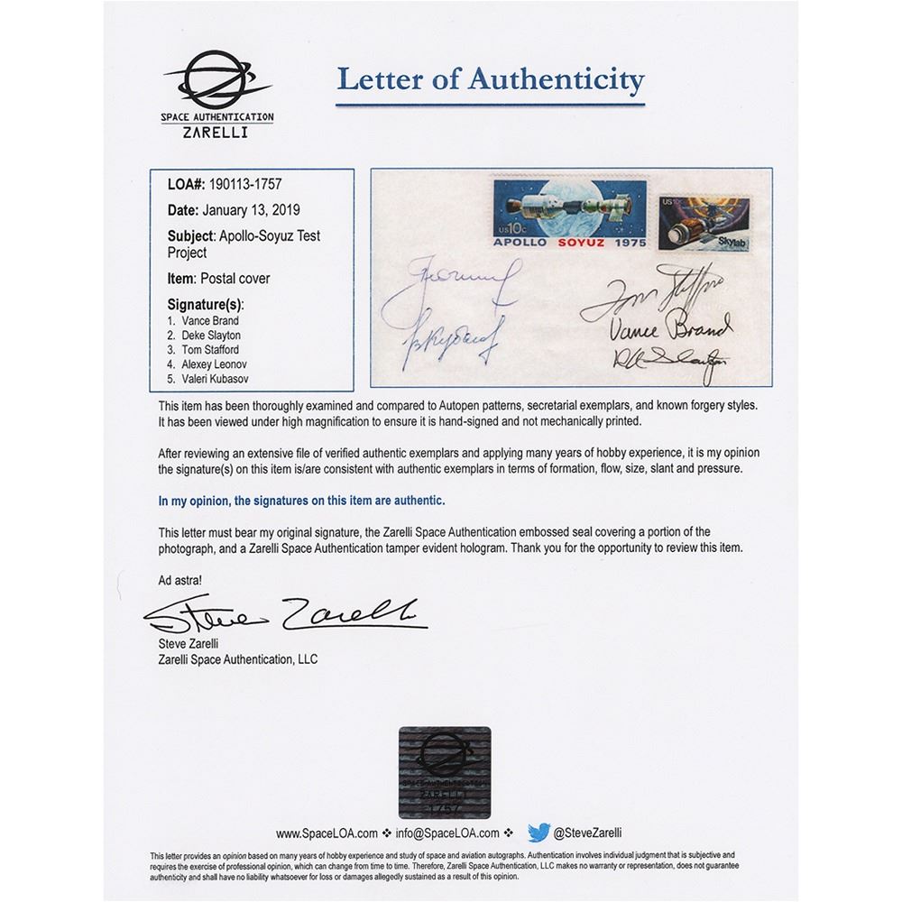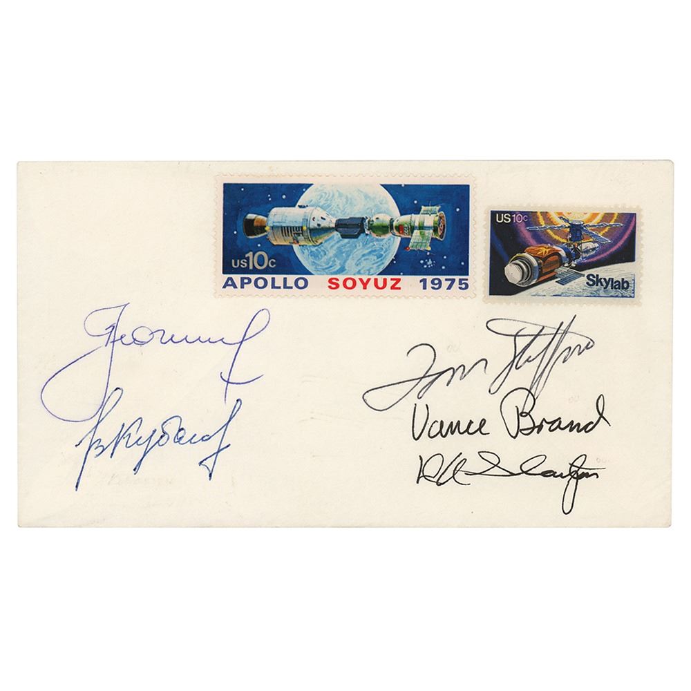 Postal cover with stamps honoring Skylab and the Apollo-Soyuz Test Project, signed in ink and ballpoint by the complete ASTP crew: Tom Stafford, Vance Brand, Deke Slayton, Alexei Leonov, and Valery Kubasov. In fine condition. Accompanied by a full letter of authenticity from Zarelli Space Authentication.