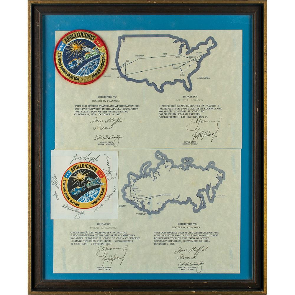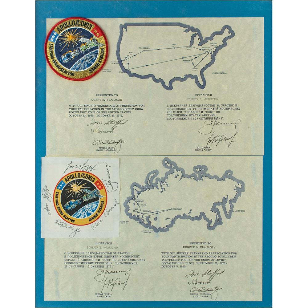 Uncommon pairing of an Apollo–Soyuz embroidered patch and Beta cloth swatch, 4˝ in diameter and 5 x 5, both of which are affixed to their respective 14 x 9.25 certificate presented to Robert B. Flanagan by the American and Soviet crews of the Apollo–Soyuz Test Project for his participation in the “Postflight Tour of the United States, October 13, 1975–October 25, 1975” and of the “Union of Soviet Socialist Republics, September 20, 1975–October 5, 1975.” Both the certificates and the Beta cloth are signed in black ink by Alexei Leonov, Valeri Kubasov, Tom Stafford, Vance Brand, and Deke Slayton. The certificates are mounted and framed to an overall size of 17.75 x 21.75. In overall fine condition. An impressive set of fully signed certificates from the Space Race-ending mission—these 'post-flight' map examples are decidedly uncommon.