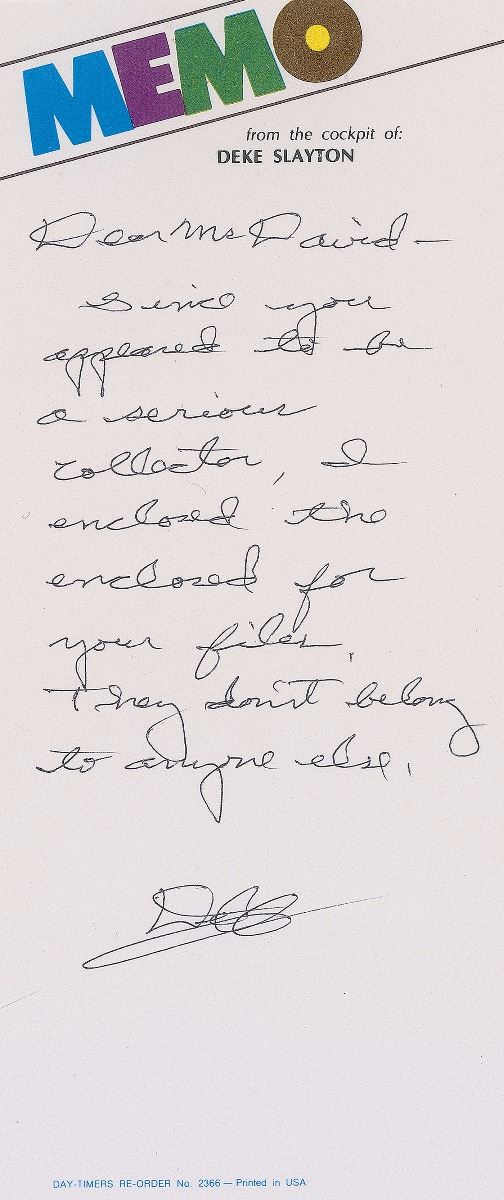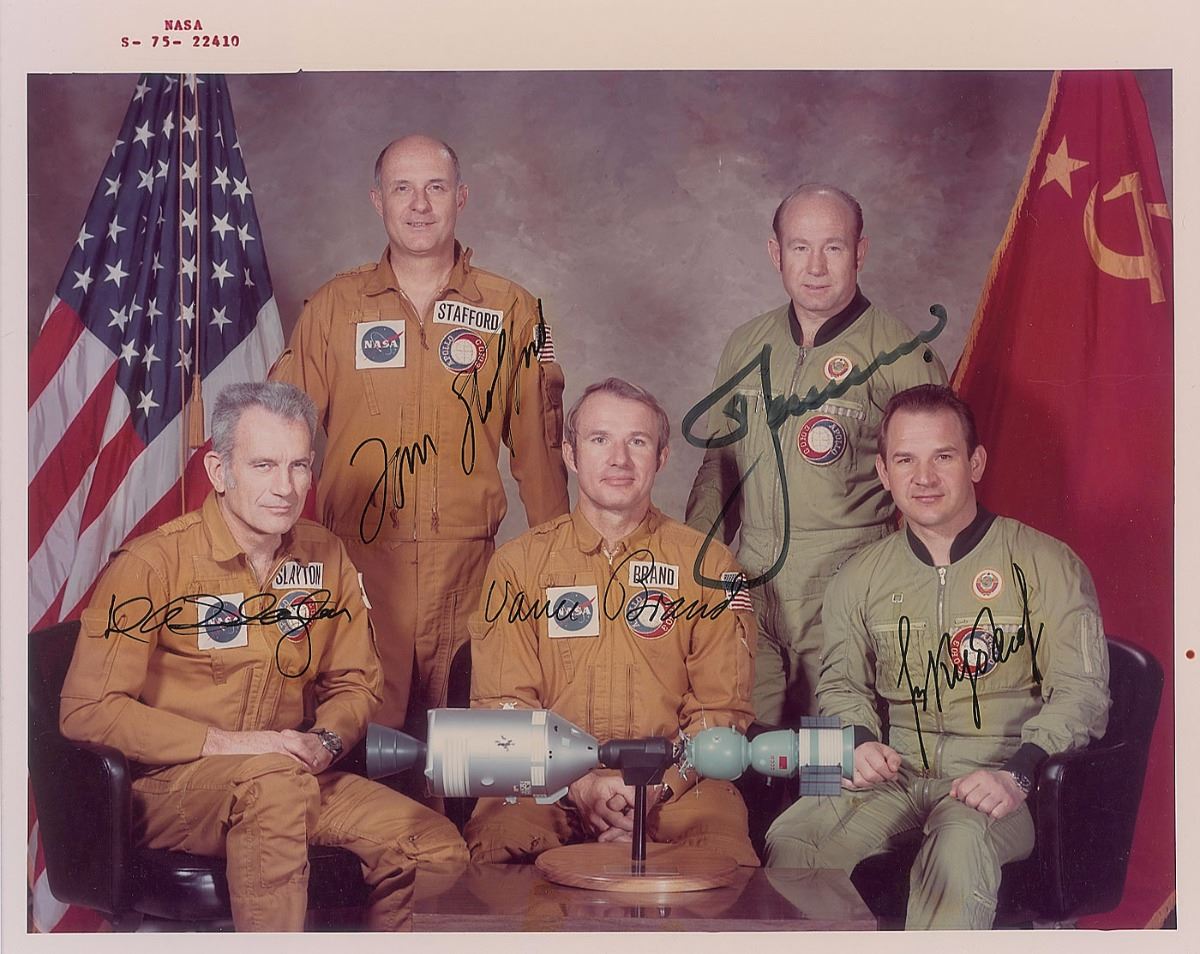 Official color satin-finish 10 x 8 ‘red-numbered’ NASA photo of the Apollo-Soyuz crew, signed in black ink by Deke Slayton, Vance Brand, Tom Stafford, and Valeri Kubasov, and in black felt tip by Alexei Leonov. In fine condition, with light bends to corners, a tiny stain to the right border, and a surface impression to the left edge. Accompanied by a handwritten letter of provenance from Slayton, in part: “Since you appeared to be a serious collector, I enclosed the enclosed for your files.” The Leon Ford Collection.