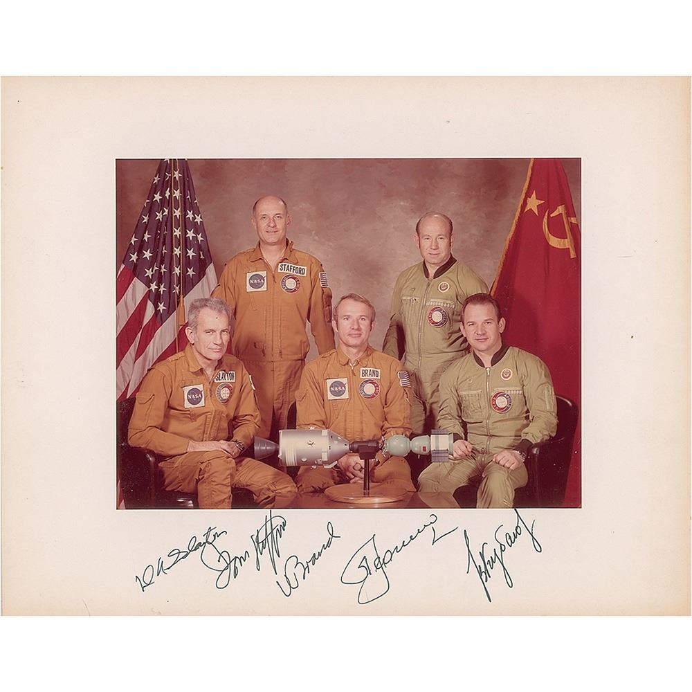 Sought-after official color semi-glossy 9.25 x 7 NASA photo of the American and Soviet crews of the historic and Space Race-ending Apollo-Soyuz mission, affixed to the original 14 x 11 mount, which is signed in black ink by Tom Stafford, Vance Brand, Deke Slayton, Alexei Leonov, and Valeri Kubasov. Reverse of mount is stamped as S-75-22410. In fine condition.