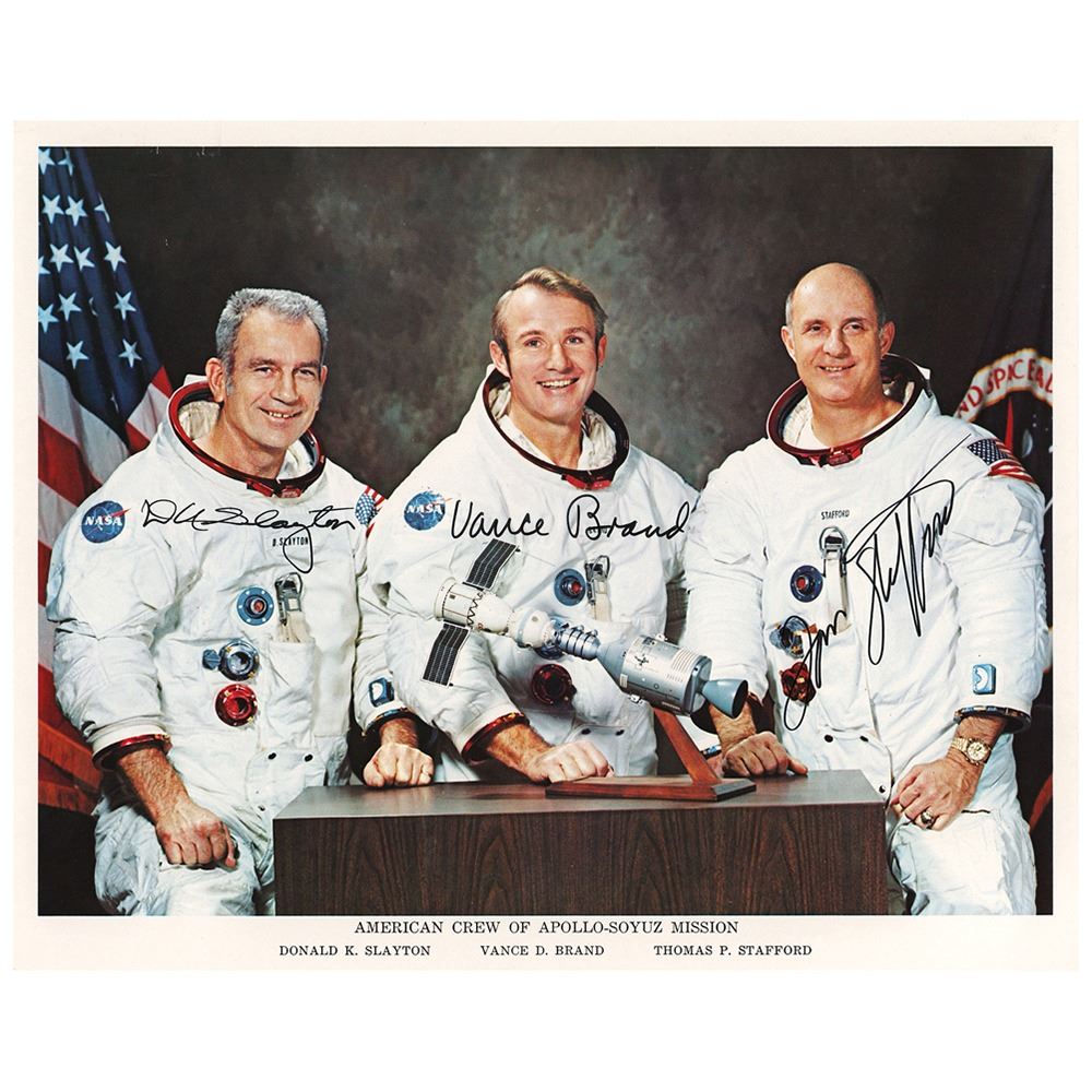 Official color 10 x 8 NASA lithograph of the American crew of the Apollo–Soyuz Test Project posing together in their white space suits, signed in black ink or felt tip by Deke Slayton, Vance Brand, and Tom Stafford. In fine condition, with a small scuff in the top border.